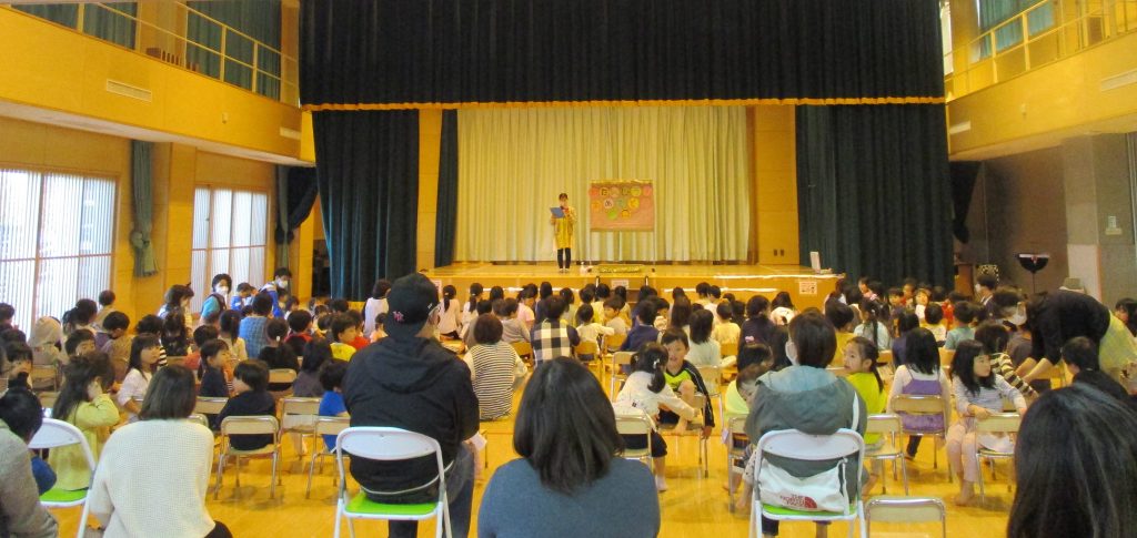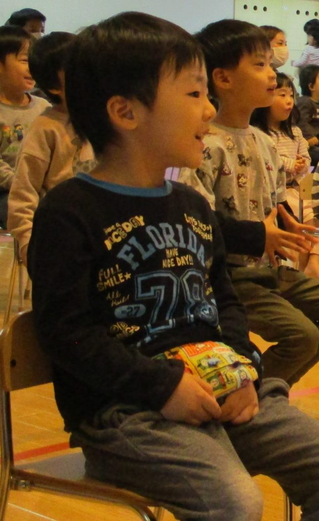 先日、10月生まれの子のお誕生会をしました。今月はステージ上で誕生児紹介です。