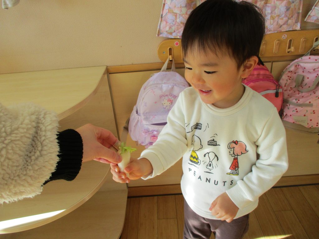 お母さんと一緒に【すずしろ】を持って、とっても嬉しそうなお子さん!ほっこり素敵な表情ですね!