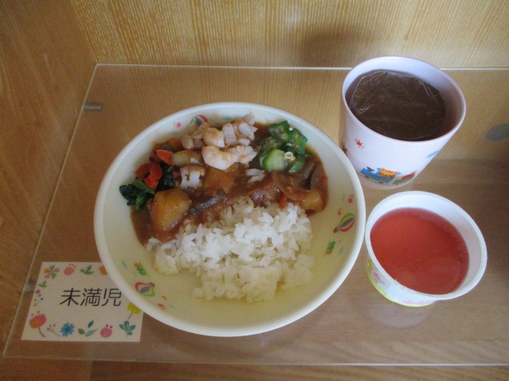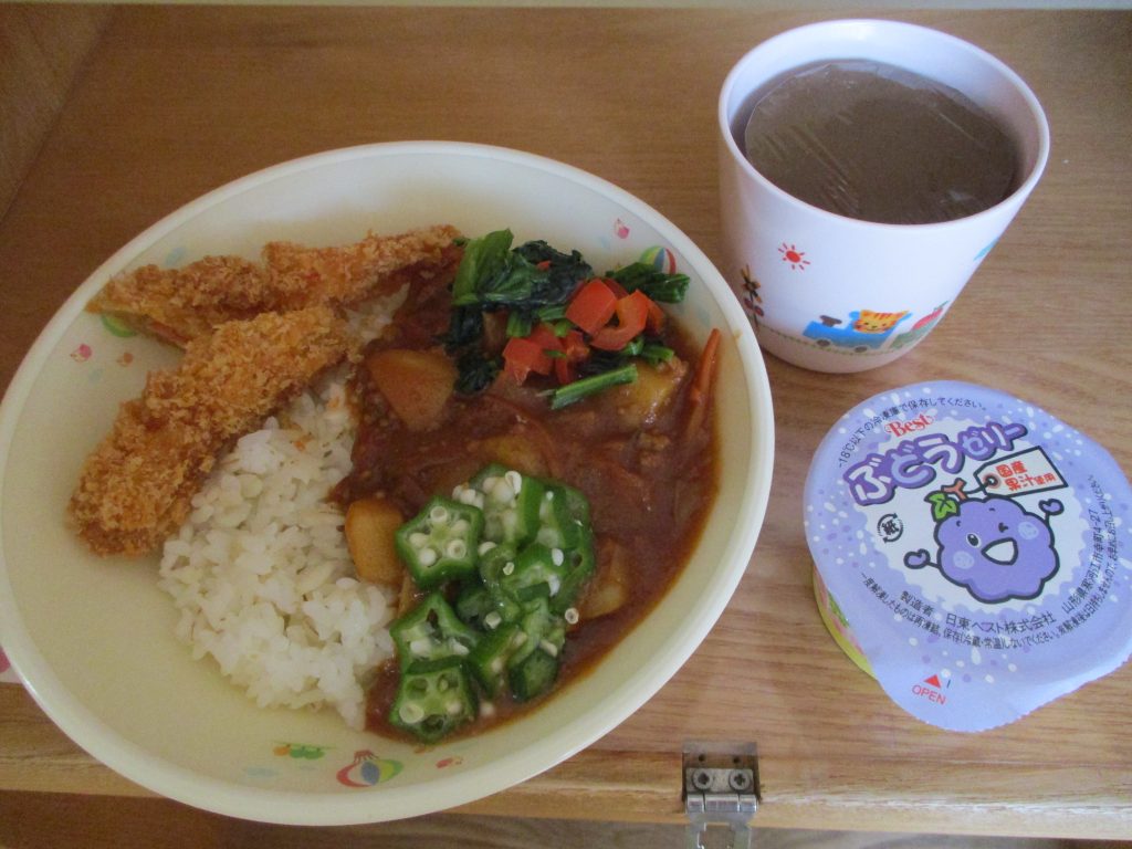 今日の献立は 旬の野菜ハヤシライス(麦ごはん)、エビフライ、国産ぶどうゼリー、麦茶