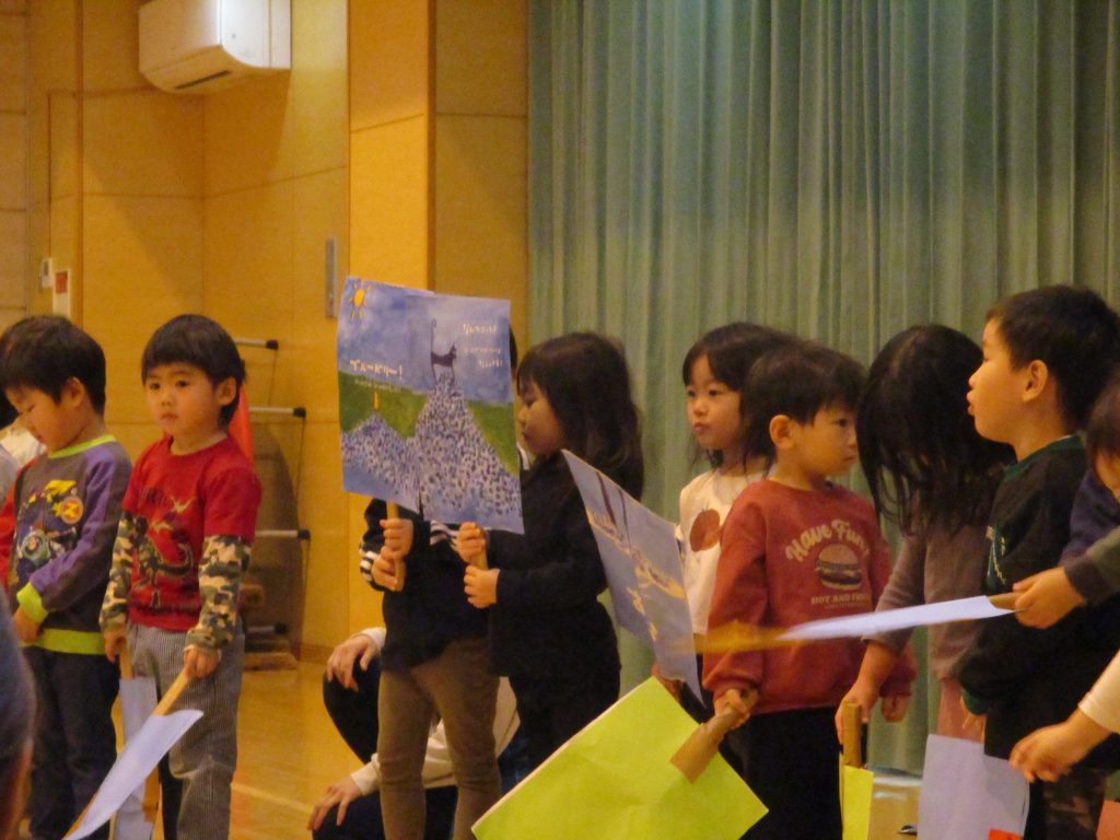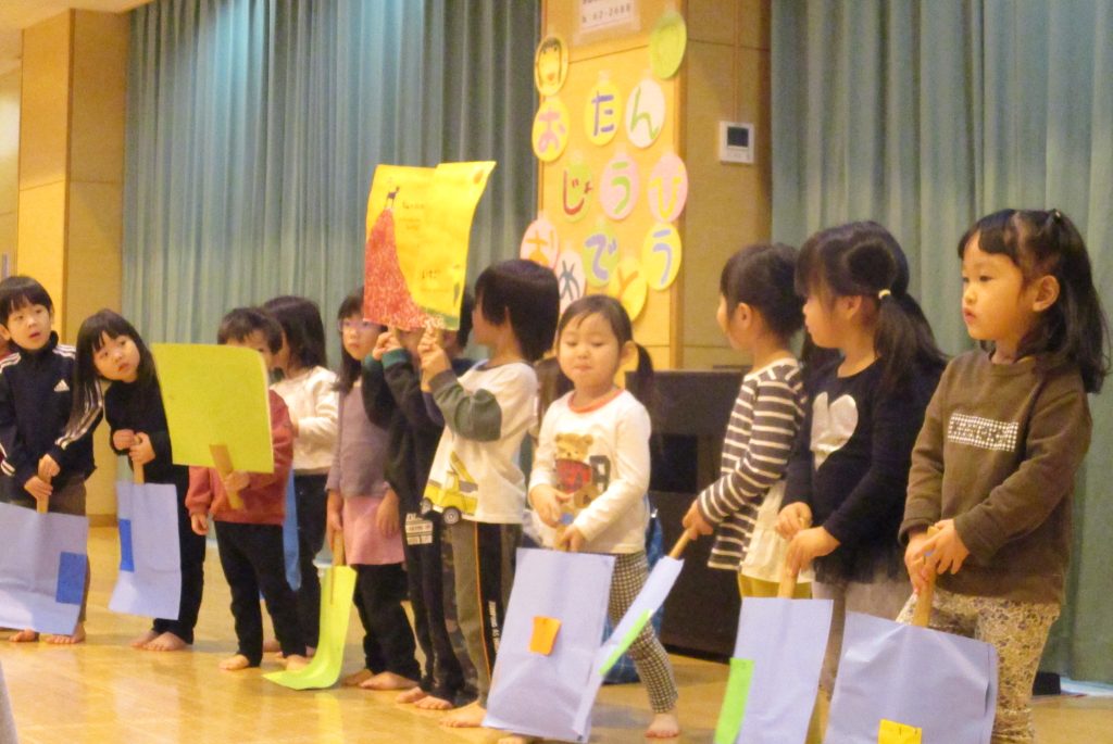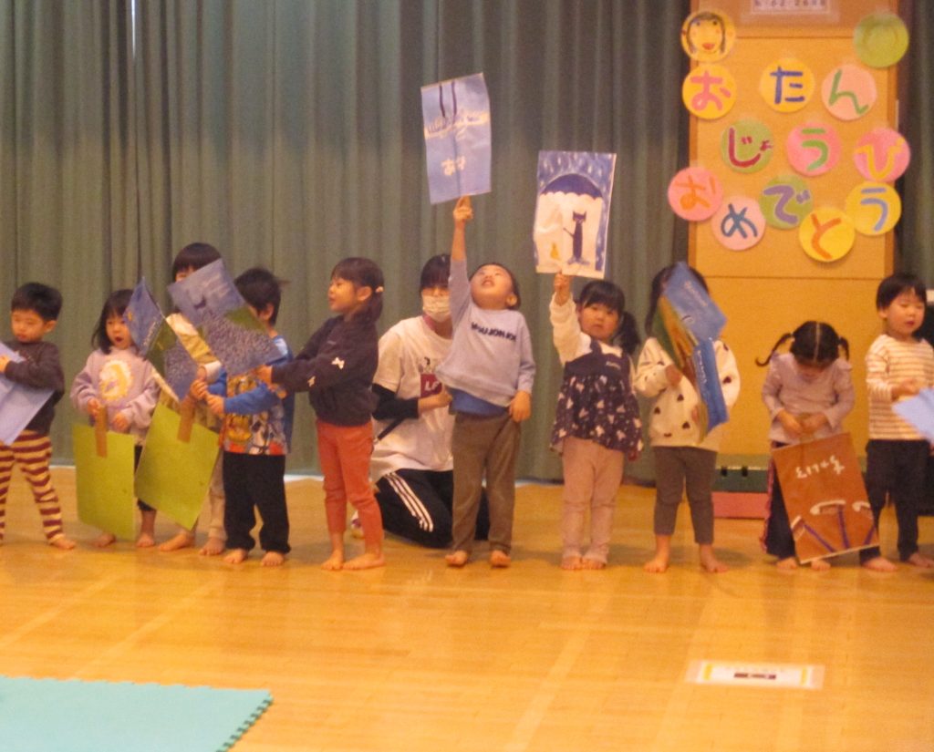 誕生日のお友達の紹介の後は、ねんしょう組からの出し物【ねこのぴーと】のペープサートでした。元気よく音に合わせて、ペープサートを上げたり下げたりしていましたよ。