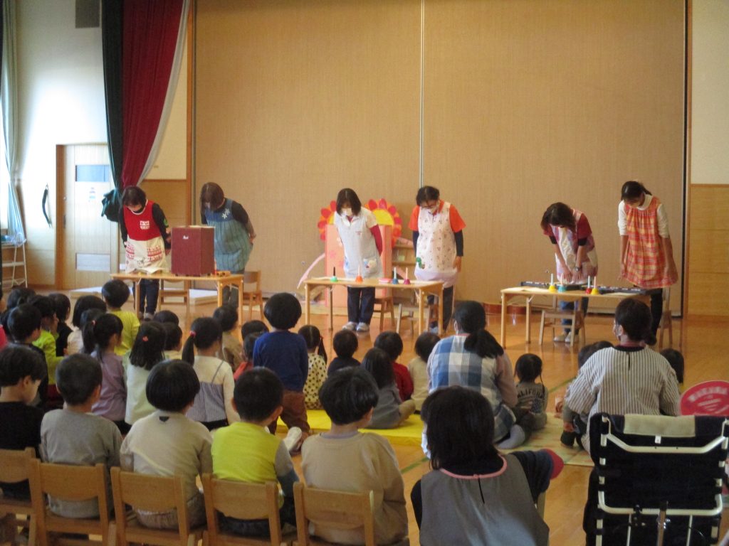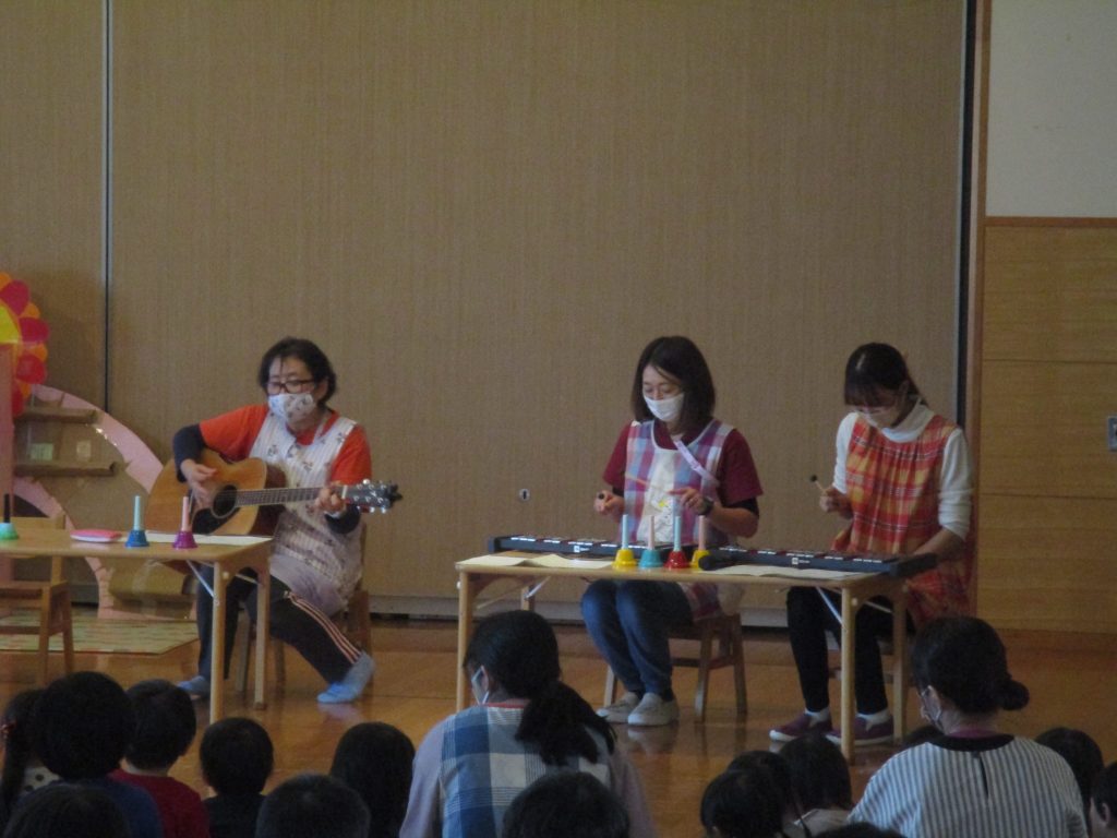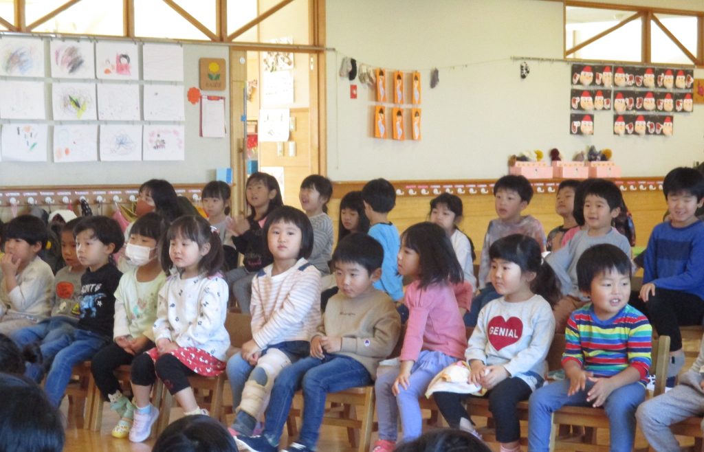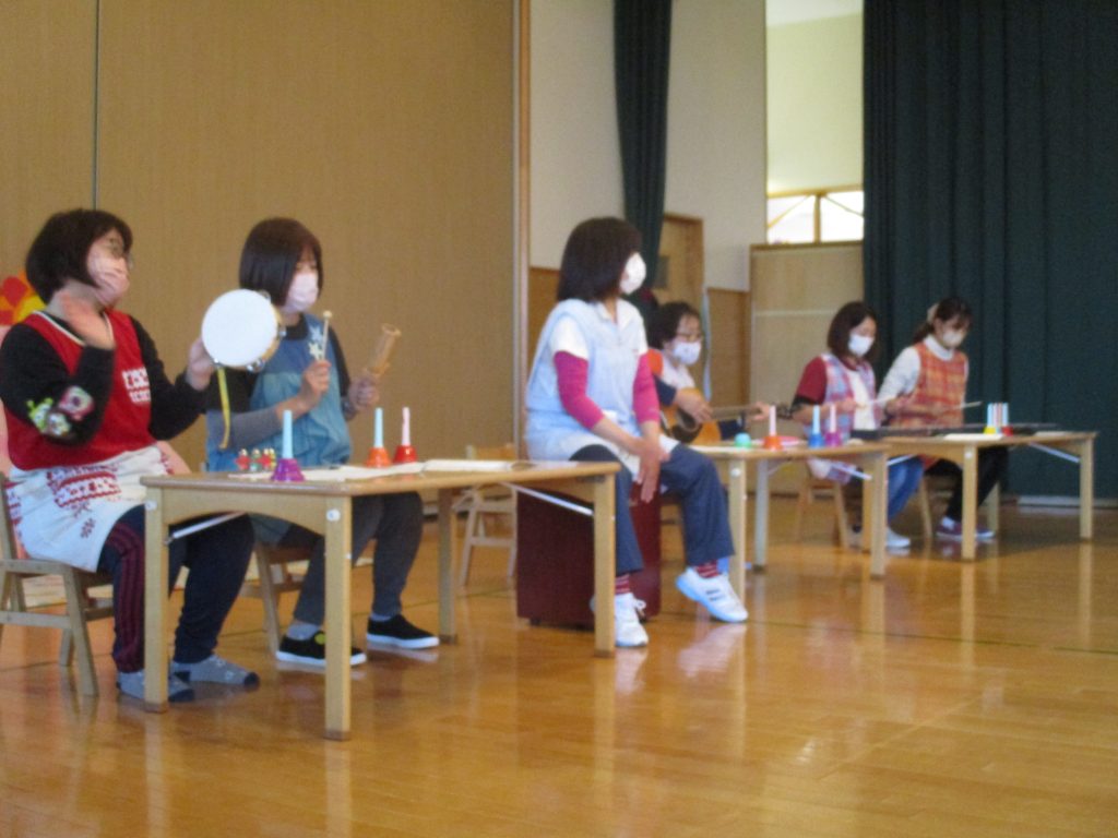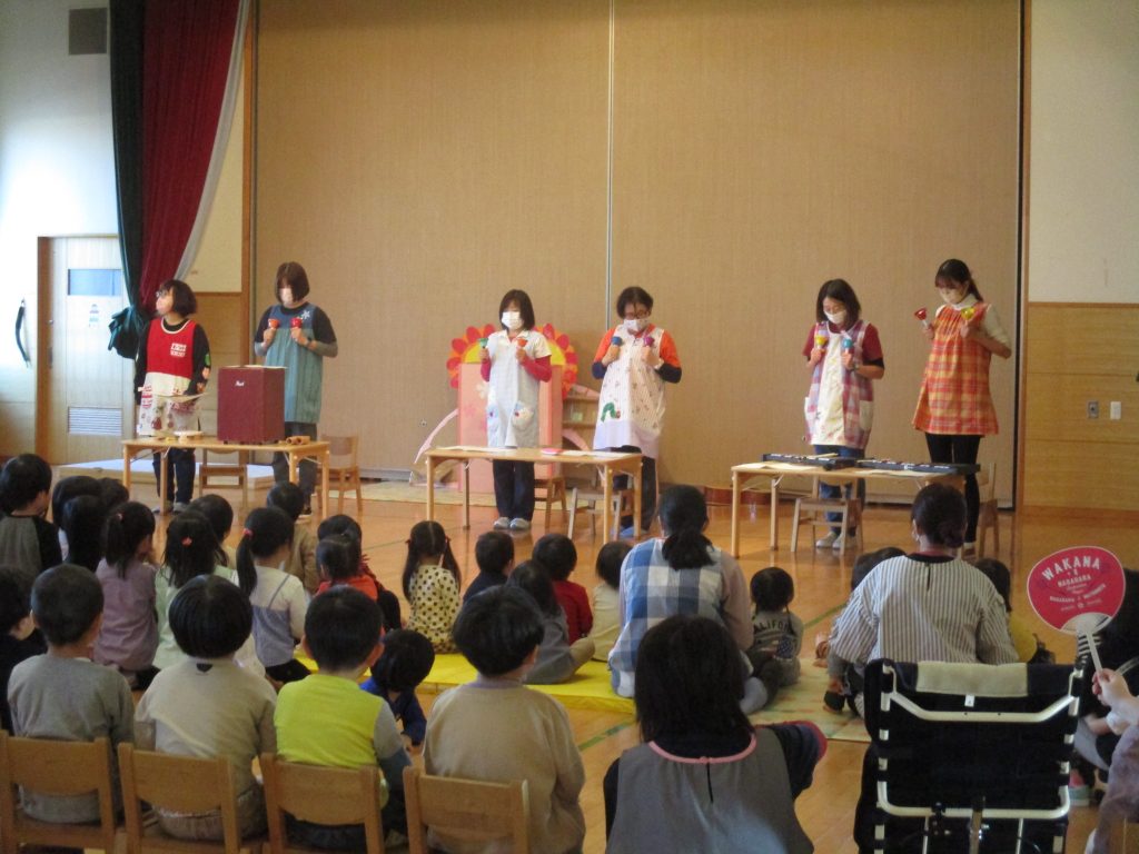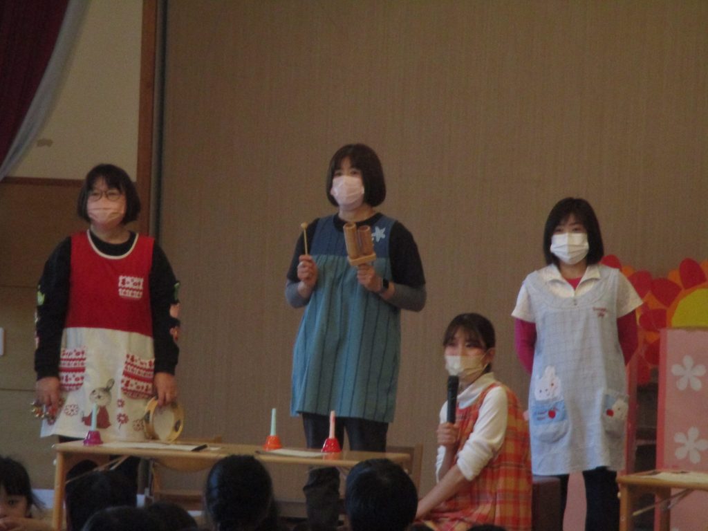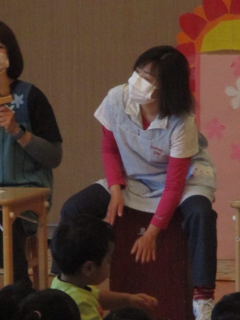 12月誕生会🎂投稿日: 更新日:2021年12月9日 投稿者: tetsunan 今日は12月生まれのお友達の誕生会がありました。 みんなでお祝いをした後、職員の出し物を見ました。 内容は、楽器の演奏会でした。 最初はハンドベルによる、「ジングルベル」♪ 二曲目は「赤鼻のトナカイ」 楽器の紹介をしてから、演奏を聴きました。 ↓この叩いて音を出す楽器の名前は、何でしょうか? 正解は「カホン」という楽器でした。 ドラムのような音がしました。 演奏に合わせて一緒に歌って楽しんでいた、子ども達です。 12月生まれのお友だち、お誕生日おめでとう! 1月の誕生会もお楽しみに☺