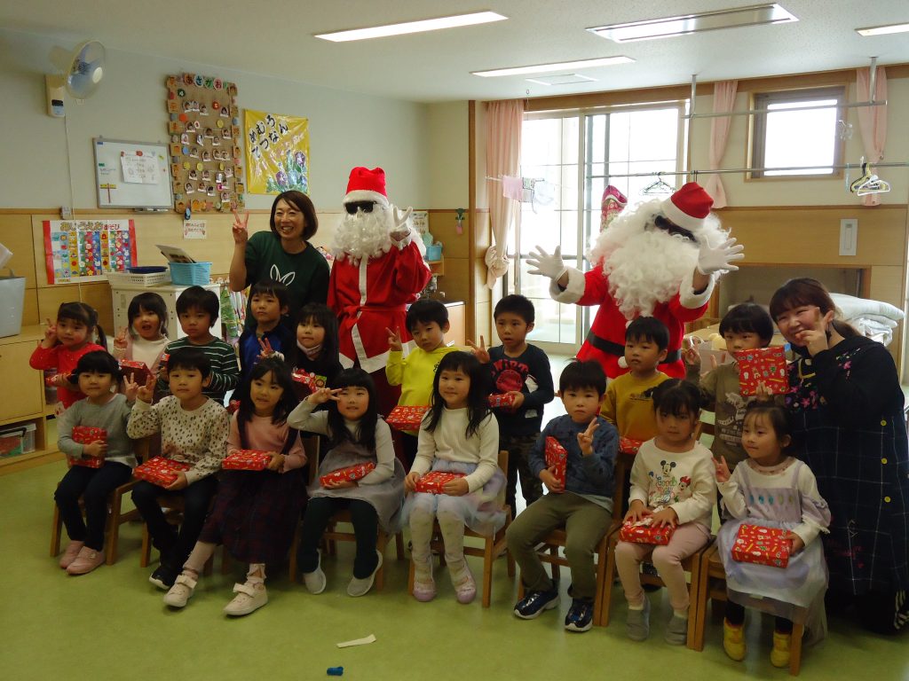 素敵なクリスマス会③(再編)投稿日: 更新日:2023年1月4日 投稿者: tetsunan 以上児組にもサンタさんは たくさん幸せを運んでいます。 たんぽぽ組は、びっくりしていましたが、喜んでいました。 あさがお組は、サンタさんが来てくれたと歓迎してました。 ひまわり組は、サンタさんに「どうやってきたの?」と質問していました。 「そりで来たよ」と教えてもらい納得してました。 楽しいクリスマス会でした。