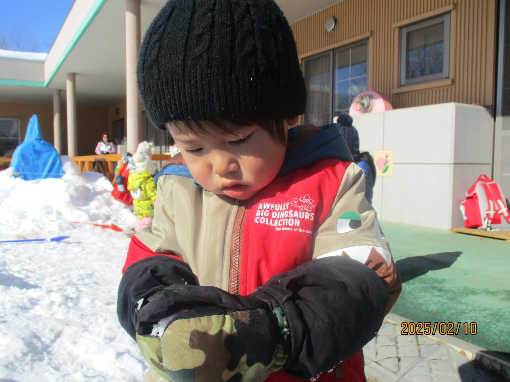 さくら組 雪遊び⛄✨投稿日: 更新日:2025年2月17日2025年2月17日 投稿者: tetsunan 先週、園庭で雪遊びをしました! 雪山を登ったり、雪を掘って温泉を作ったり、ソリに乗ったりして遊びました⛄ ソリを引っ張ってもらい良い笑顔です!ソリ楽しいね~! スコップで雪を掘ると宝石(色水氷)が出てきて興味津々です✨ 雪山のてっぺんまで登りました✨ 家の中でピザ屋さんがオープンしました! 2人で協力して雪を掘って温泉を作りました! 雪山に登り、いい笑顔ですね! 積もった雪で沢山楽しむ事ができましたよ!✨ まだまだ雪が沢山あるのでこれからも雪遊びを楽しんでいきたいと思います!