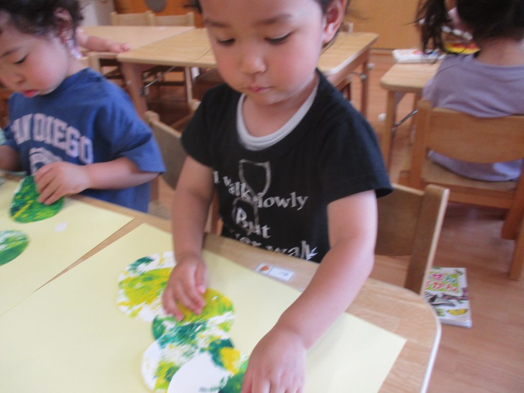ビニール袋を膨らませ風船のようにしたものに緑や黄色の絵具を付けてスタンプをしました。袋に出来たシワが一人ひとり違うので、色々な模様が出来ました。