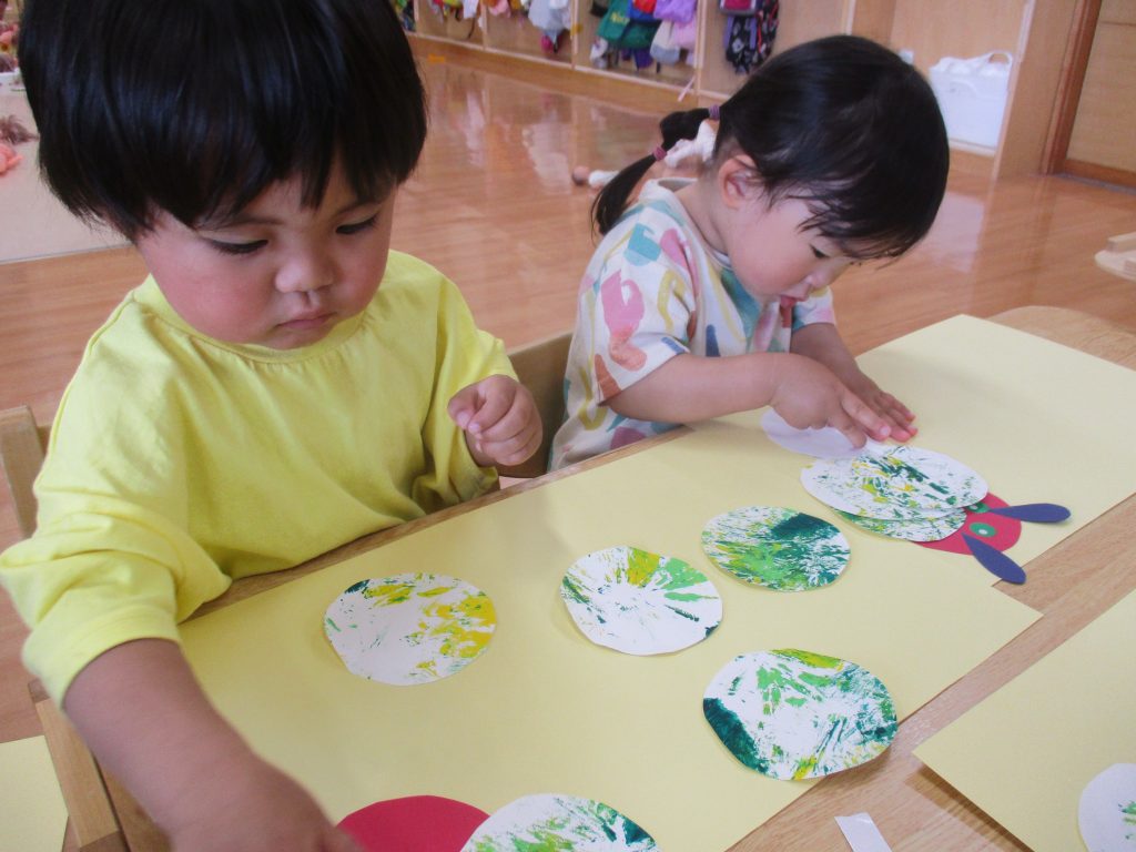 手に絵の具が付いていても、ポンポンとスタンプを楽しんでいました。