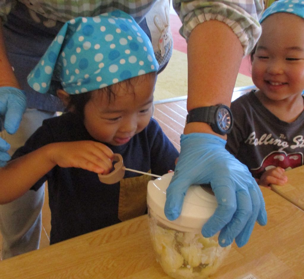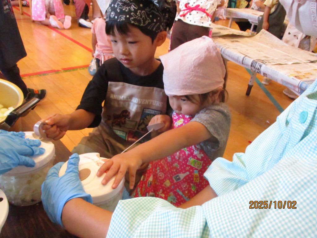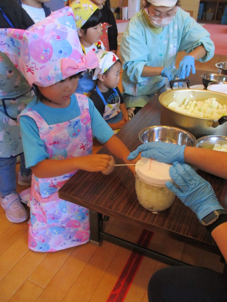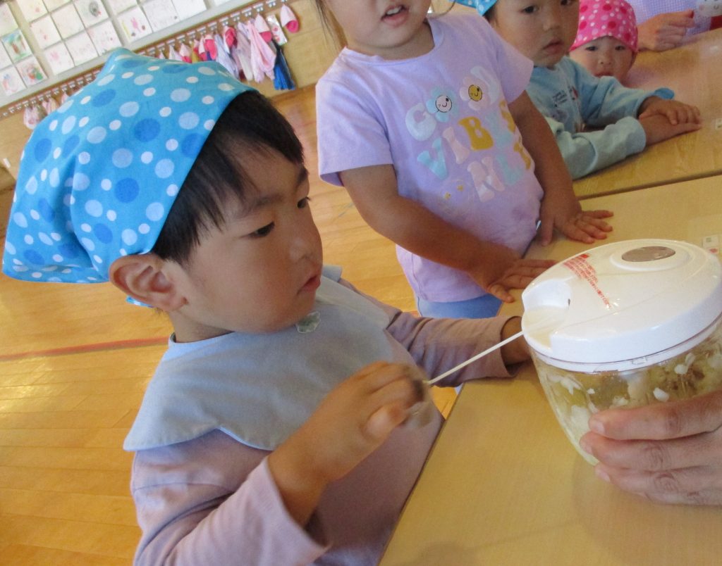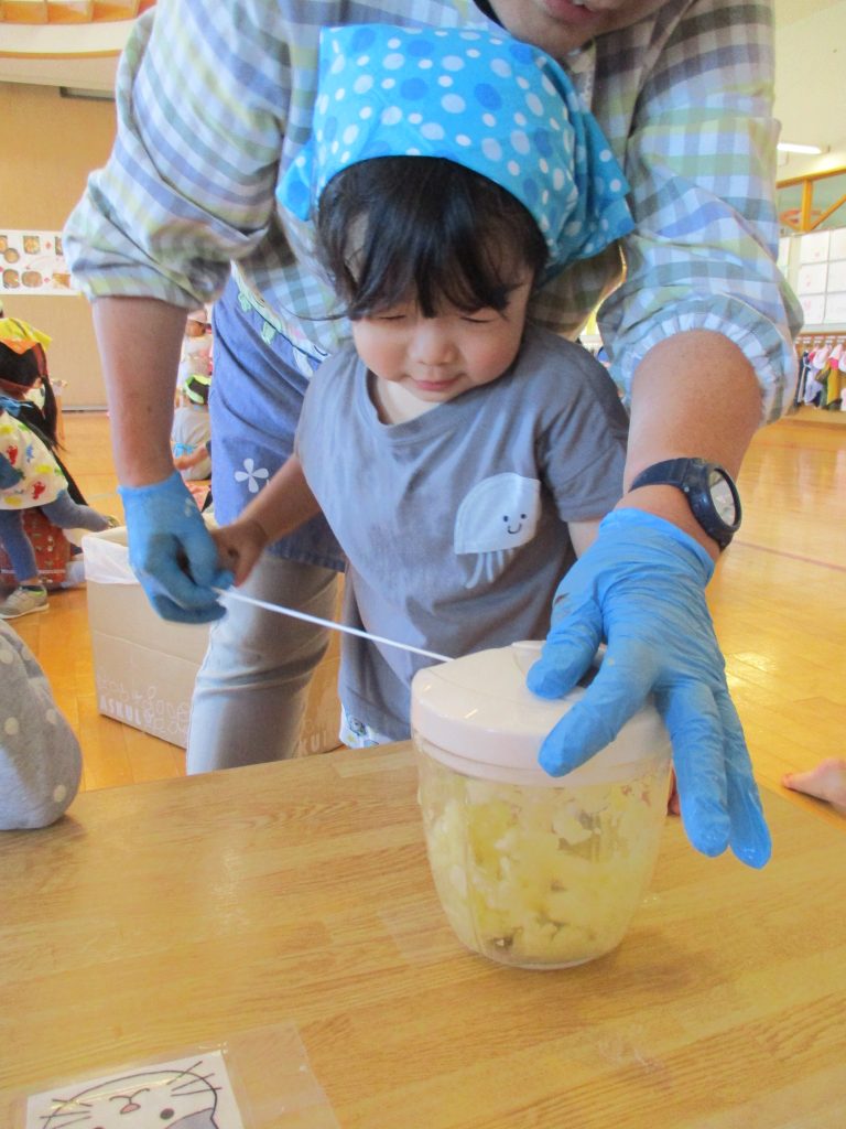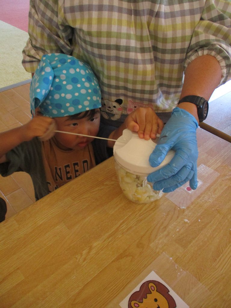 さくら組は、りんごをぶんぶんチョッパーで切りました。