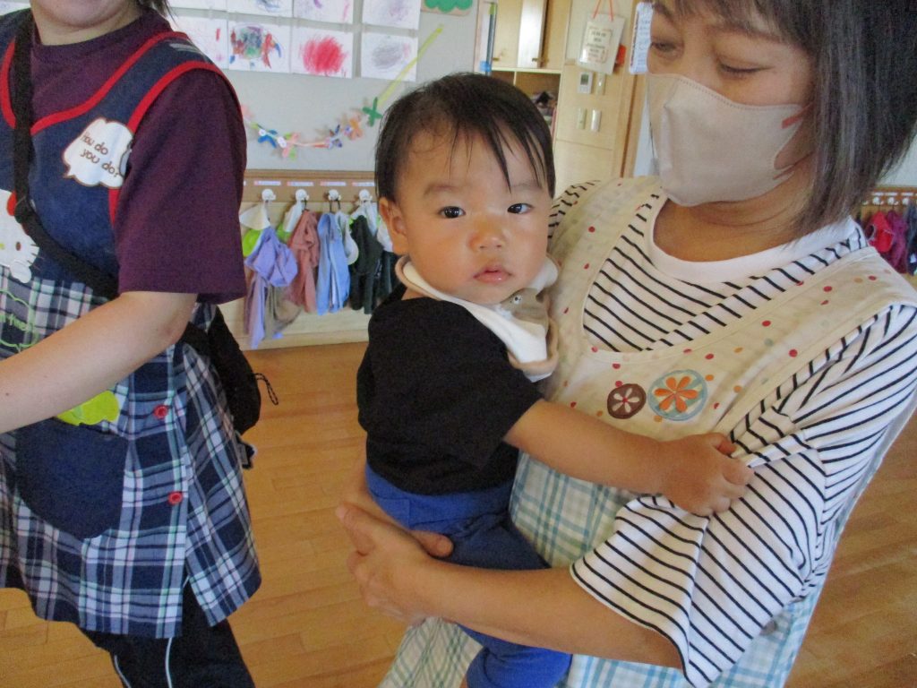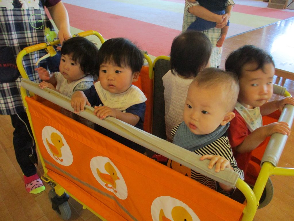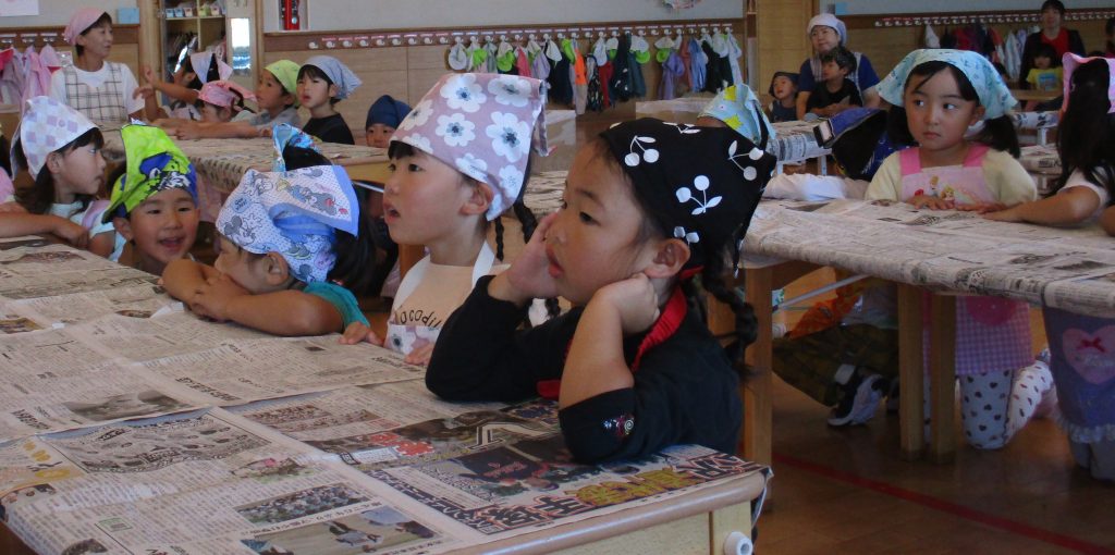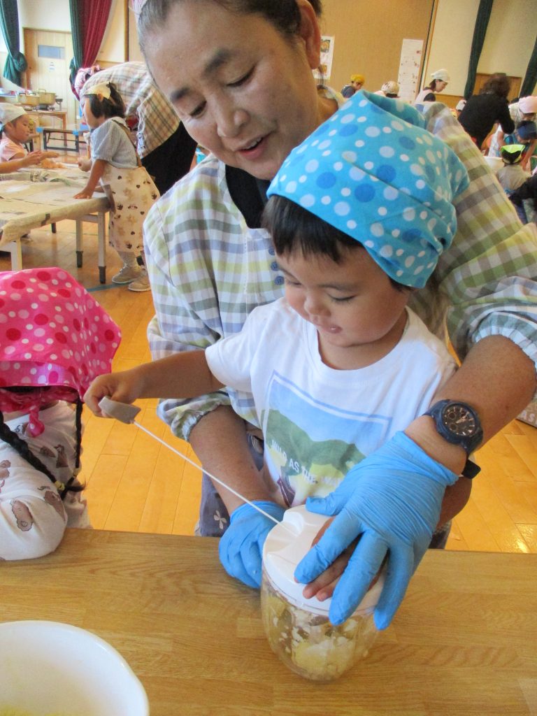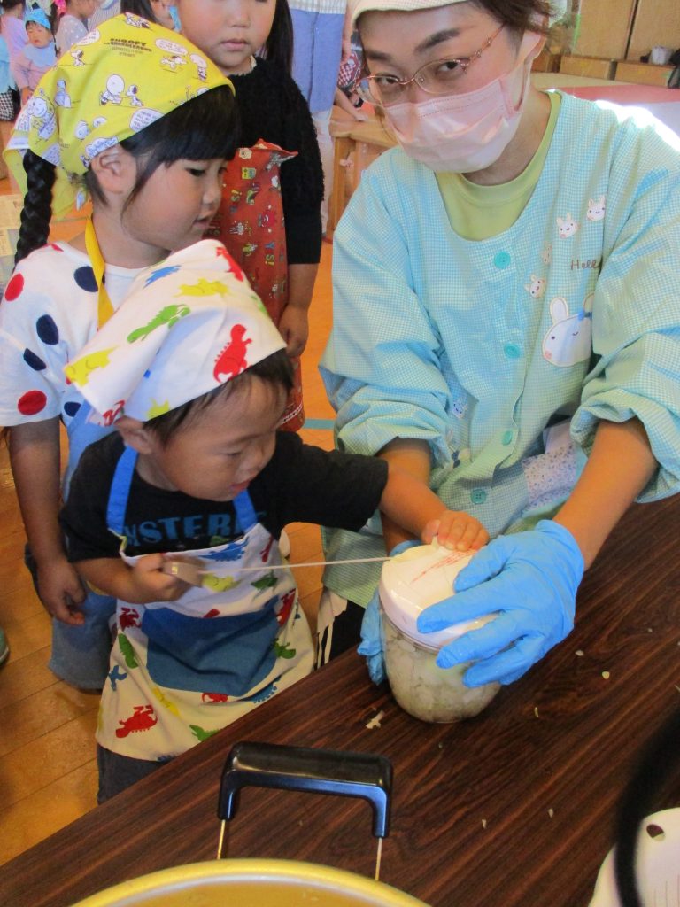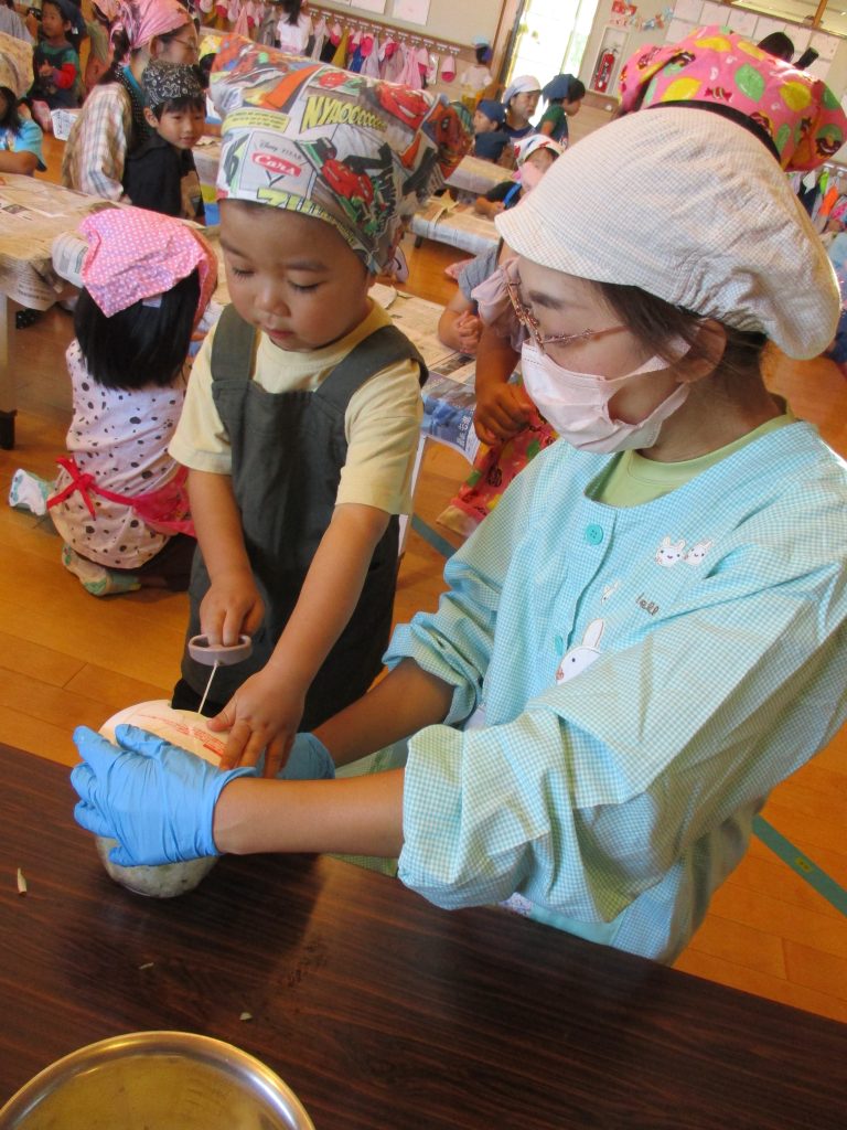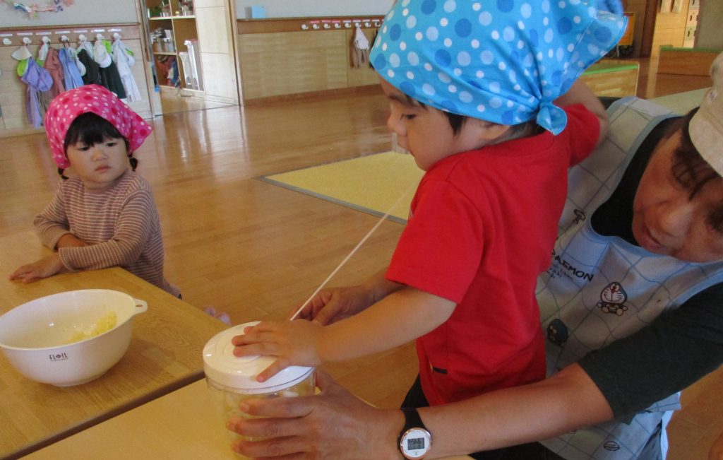 さくら組は、りんごをぶんぶんチョッパーで切りました。