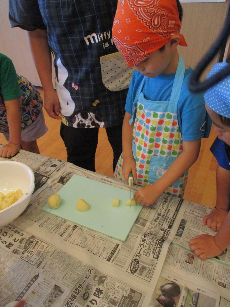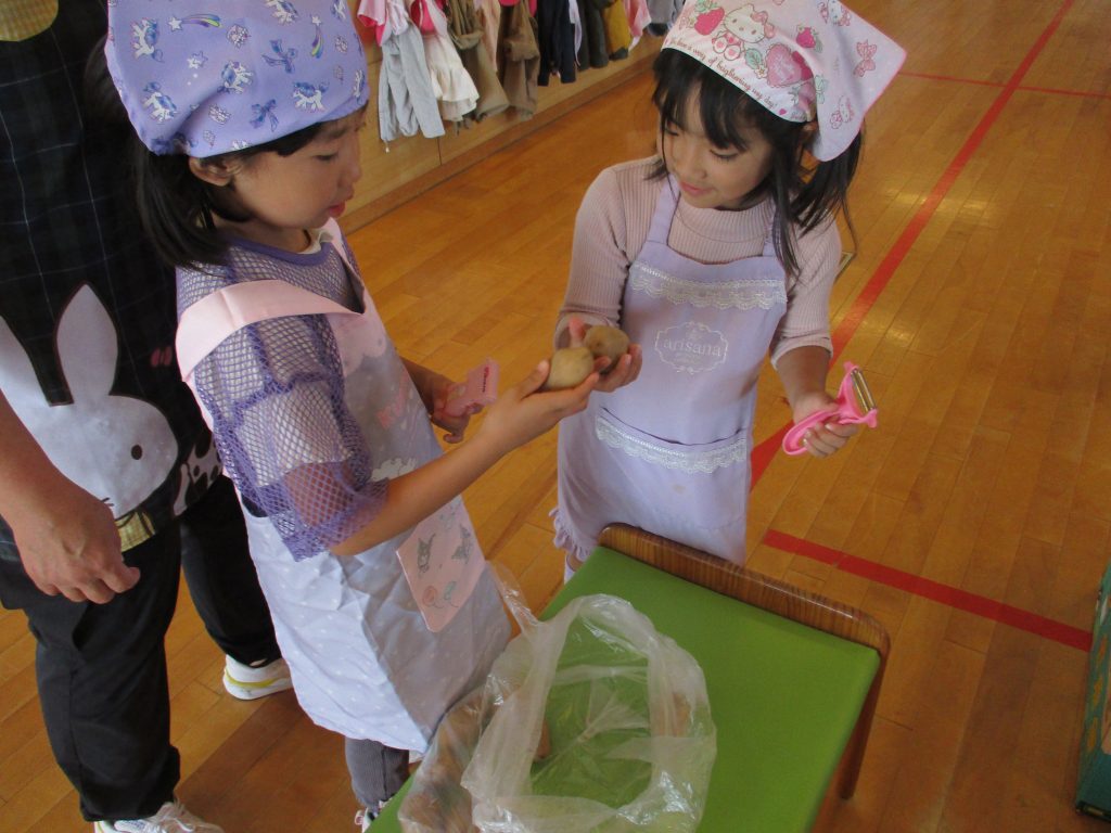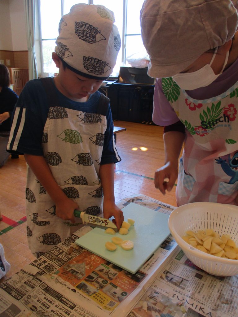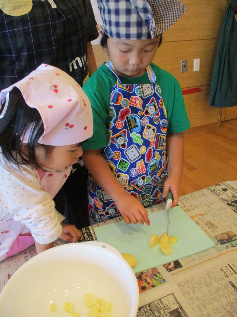 ひまわり組は、ピーラーでじゃがいもの皮をむき、包丁で切りました。
