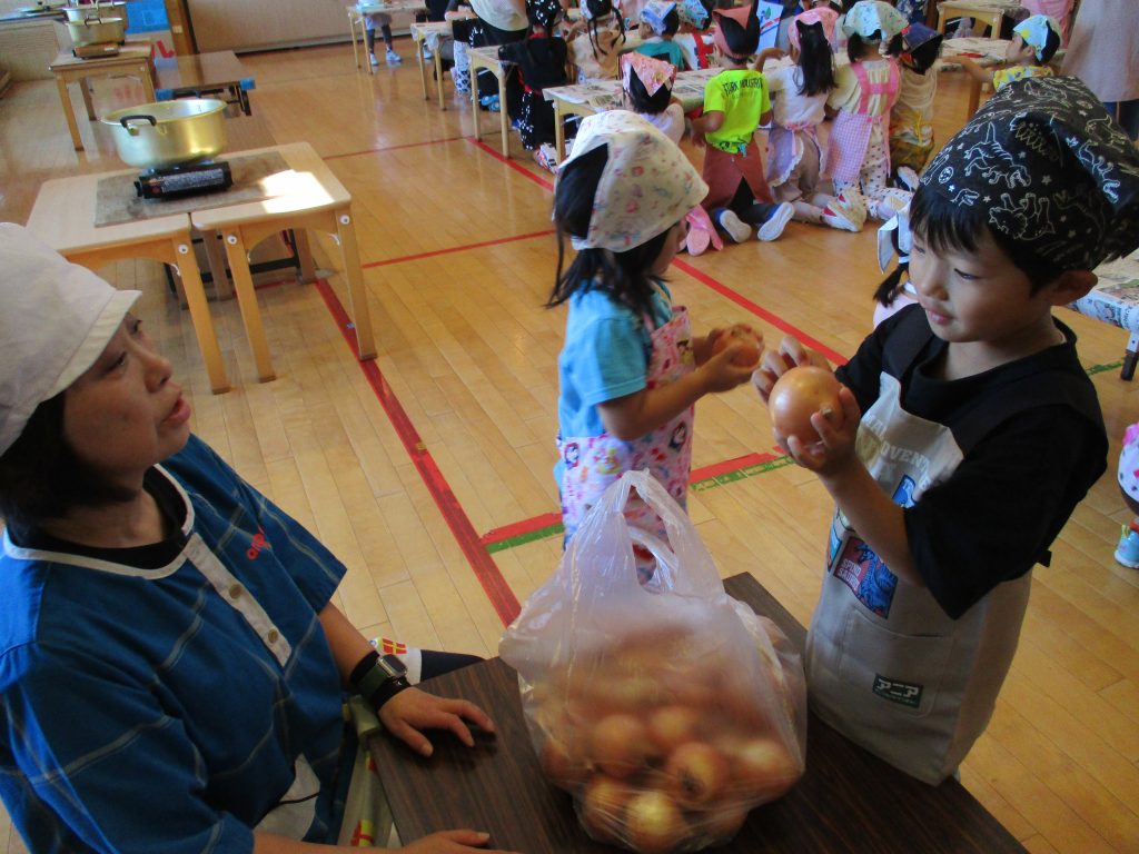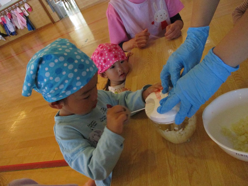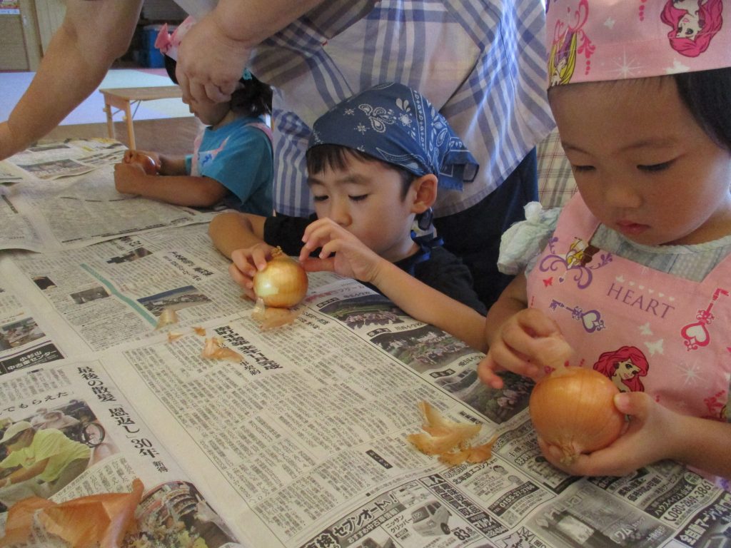 たんぽぽ組は玉ねぎの皮をむき、ぶんぶんチョッパーできざみました。