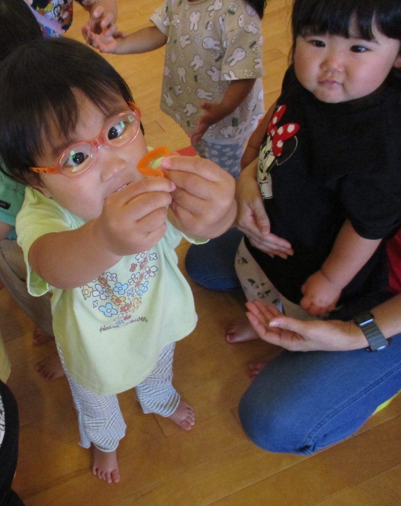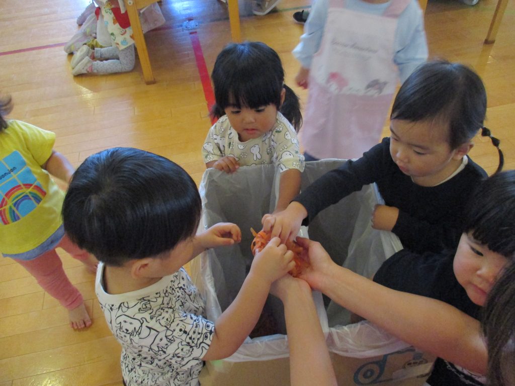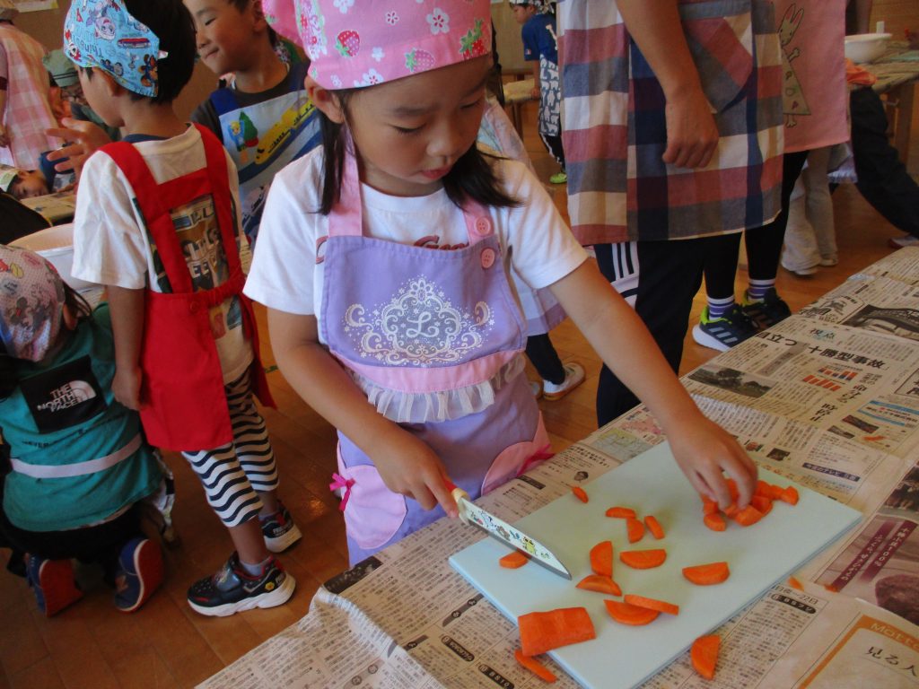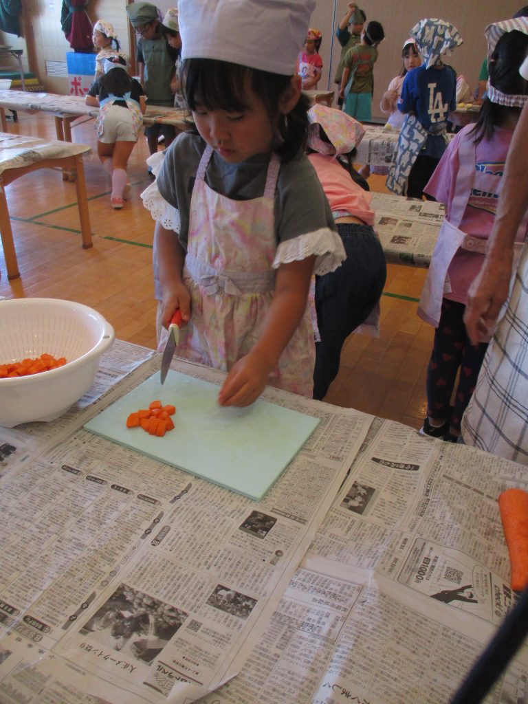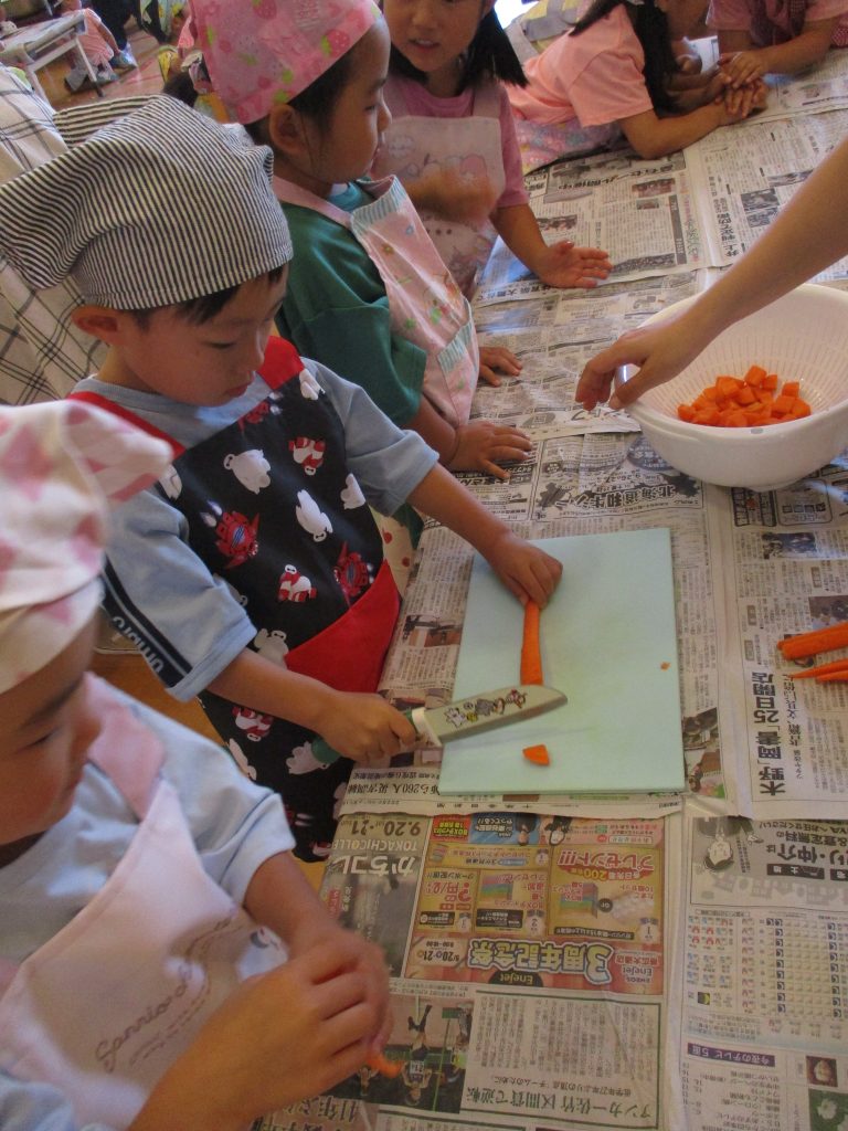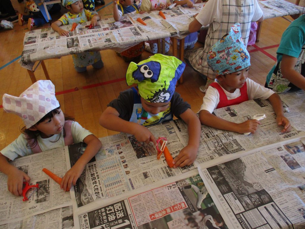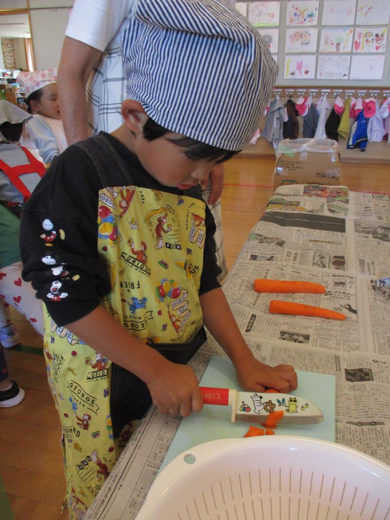 あさがお組は、ピーラーで人参の皮をむき、包丁で切りました。