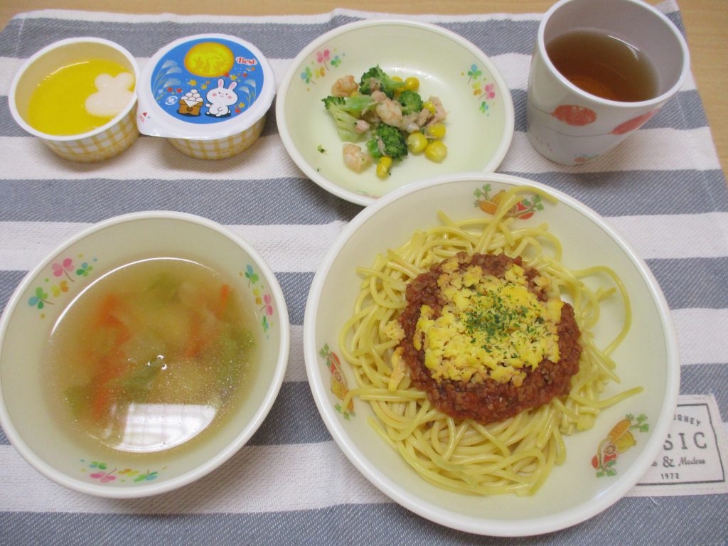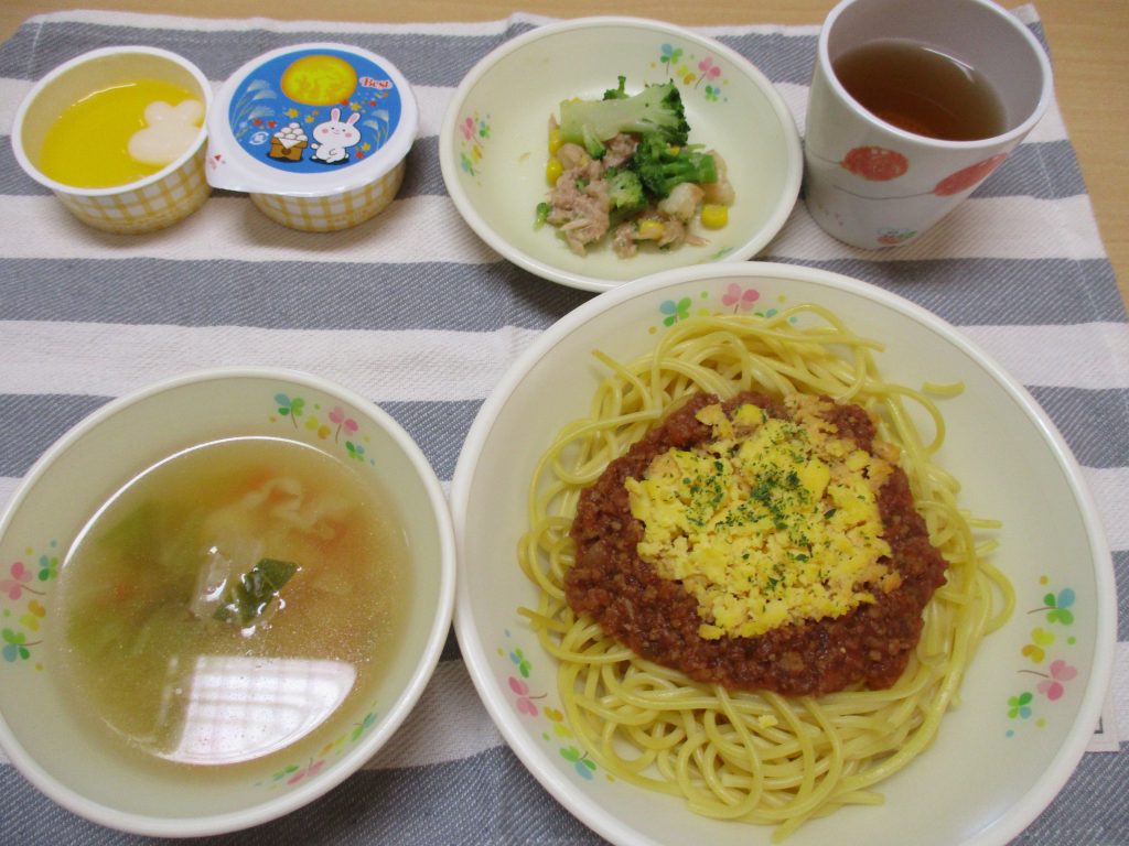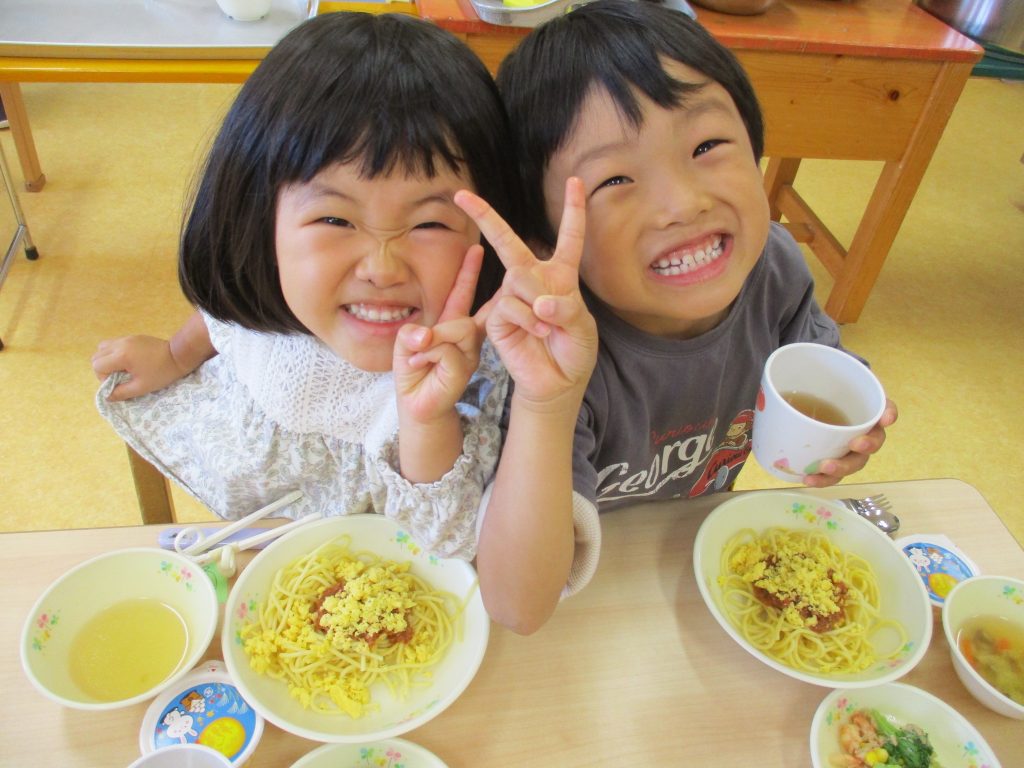 誕生会の給食★10月投稿日: 更新日:2025年10月9日 投稿者: tetsunan 10月の誕生会の給食メニューは、 『炒り卵とミートのパスタ』『ブロッコリーとエビのサラダ』『野菜スープ』 『十五夜デザート』『麦茶』でした! 【3歳以上児】 【未満児】 10月は、お月見にちなんで、ミートパスタの上に炒り卵をのせて、お月見パスタを作りました。 ミートパスタは子ども達に人気のメニューの1つです! 「お月様みたいだね^^」 と、大喜びで食べていましたよ。 10月生まれのお友達、お誕生日おめでとう!! 沢山食べて、大きくなってね!