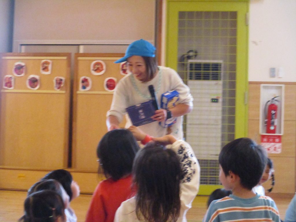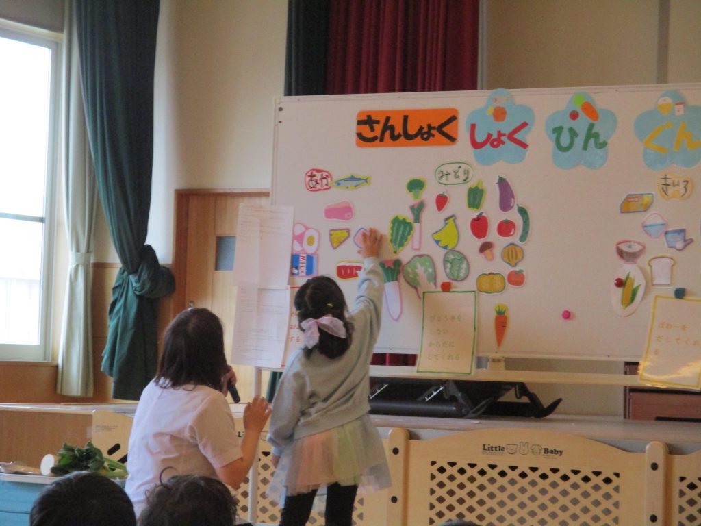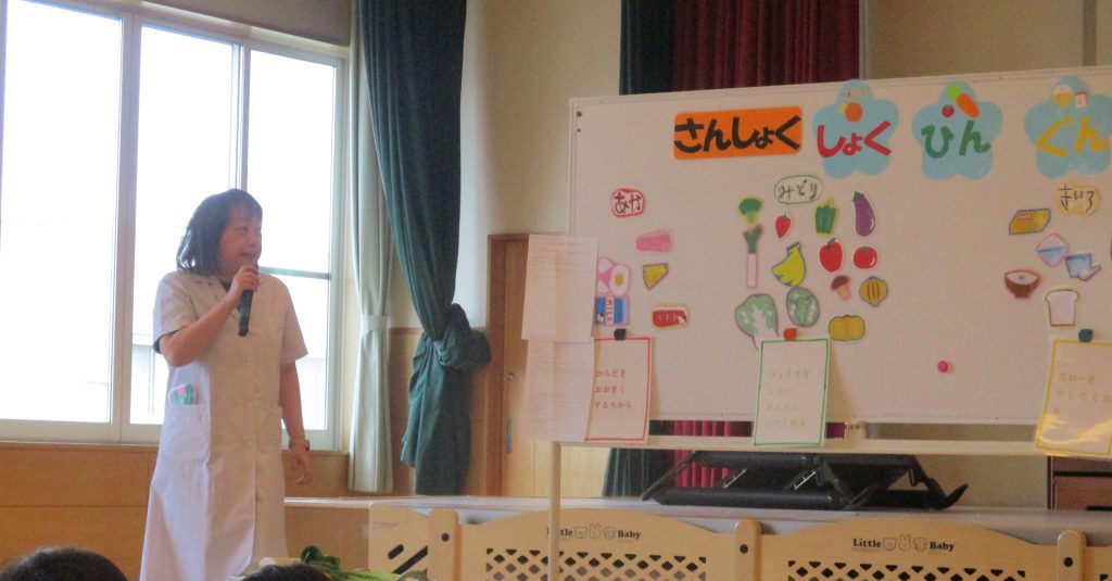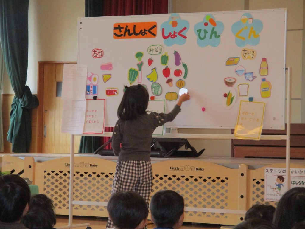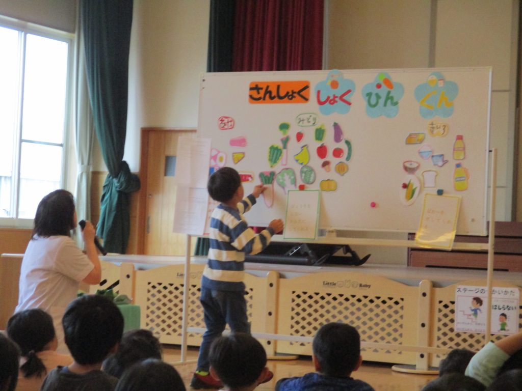 「お肉、お魚、ご飯、パン、野菜もしっかり食べて元気な強い体になろうね!」