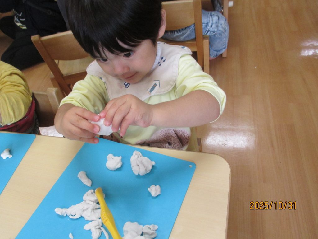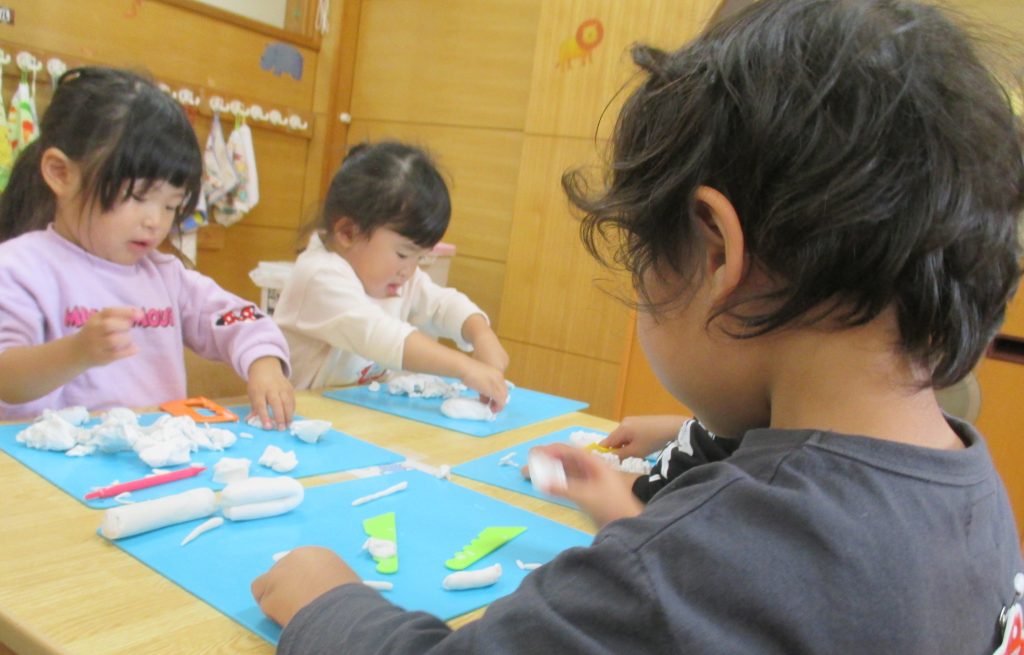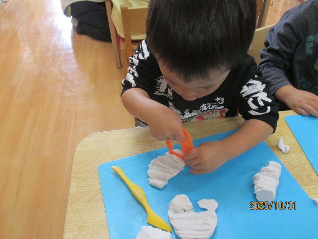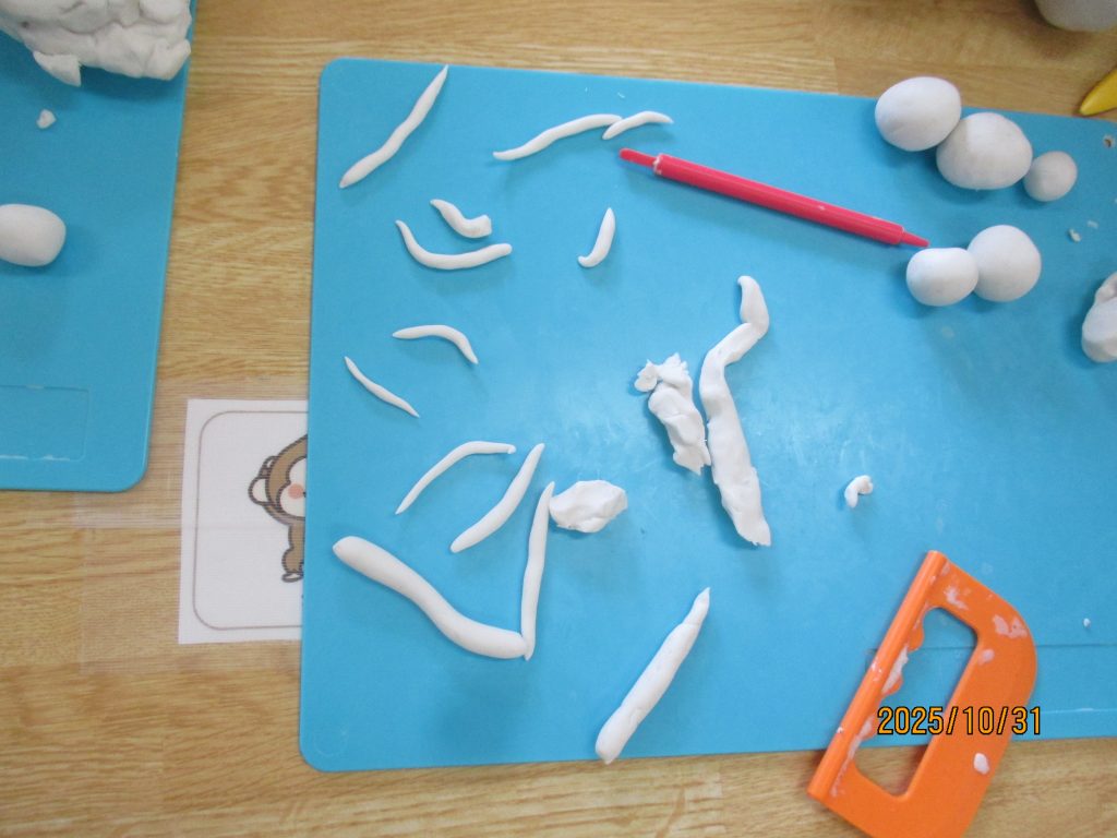 さくら組 粘土遊び投稿日: 更新日:2025年11月6日 投稿者: tetsunan 粘土遊びをしました。 今回は、粘土で使う道具を出し楽しみましたよ。 粘土を切ってみたよ。とっても真剣です。 粘土をこねて、研究中! ヘビをいっぱい作ったよ。 自分で丸めてみたよ。 ケーキを作り! 完成したよ!! 棒にクルクル巻いて遊んでみた!! 自分たちで、動物や食べ物等、好きな物を作れるようになってきました。 「○○なんだよ~」とイメージした物を作って、お友達と共有しながら楽しんでいましたよ。