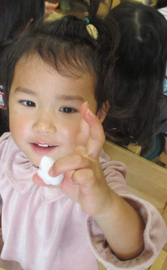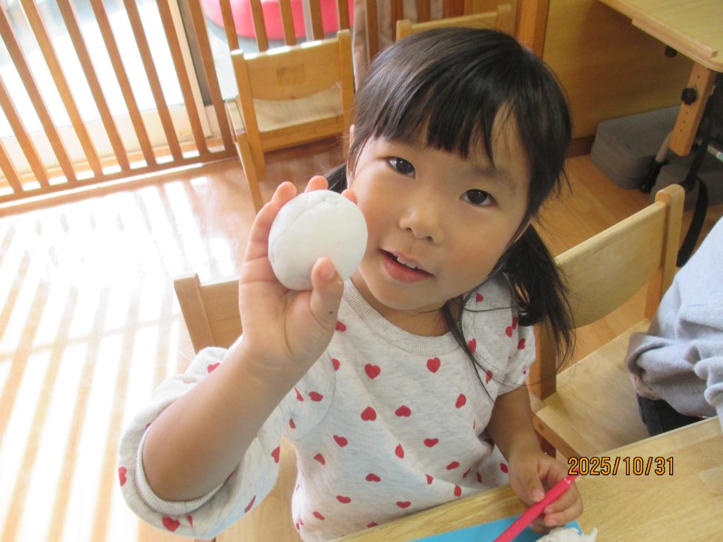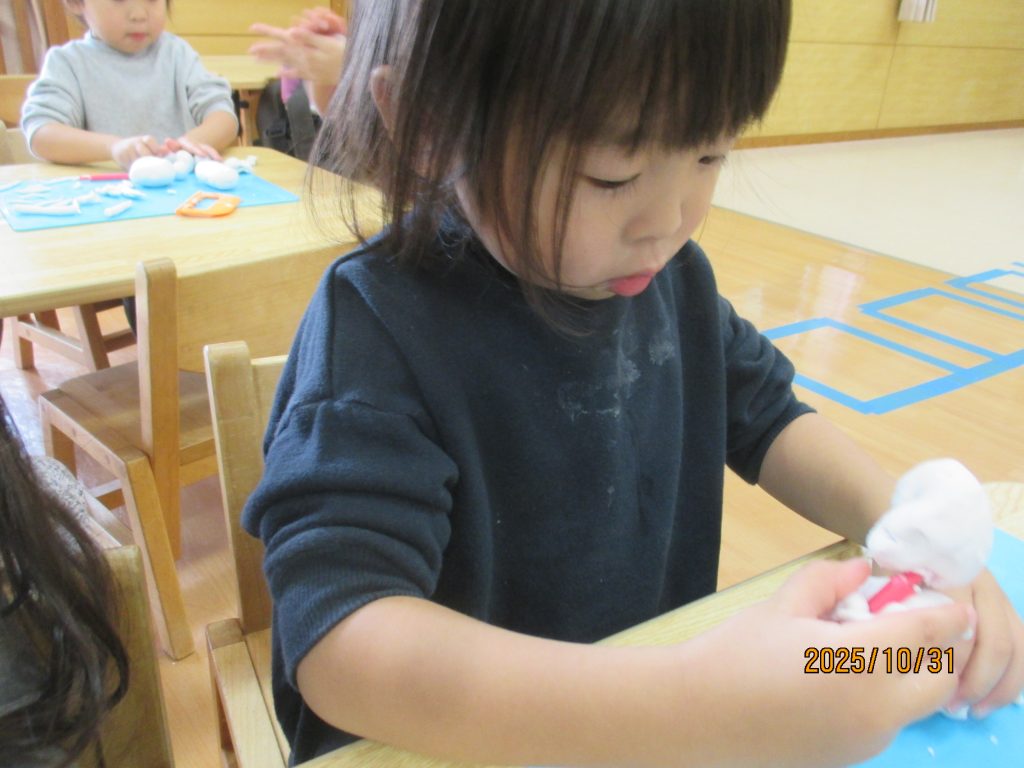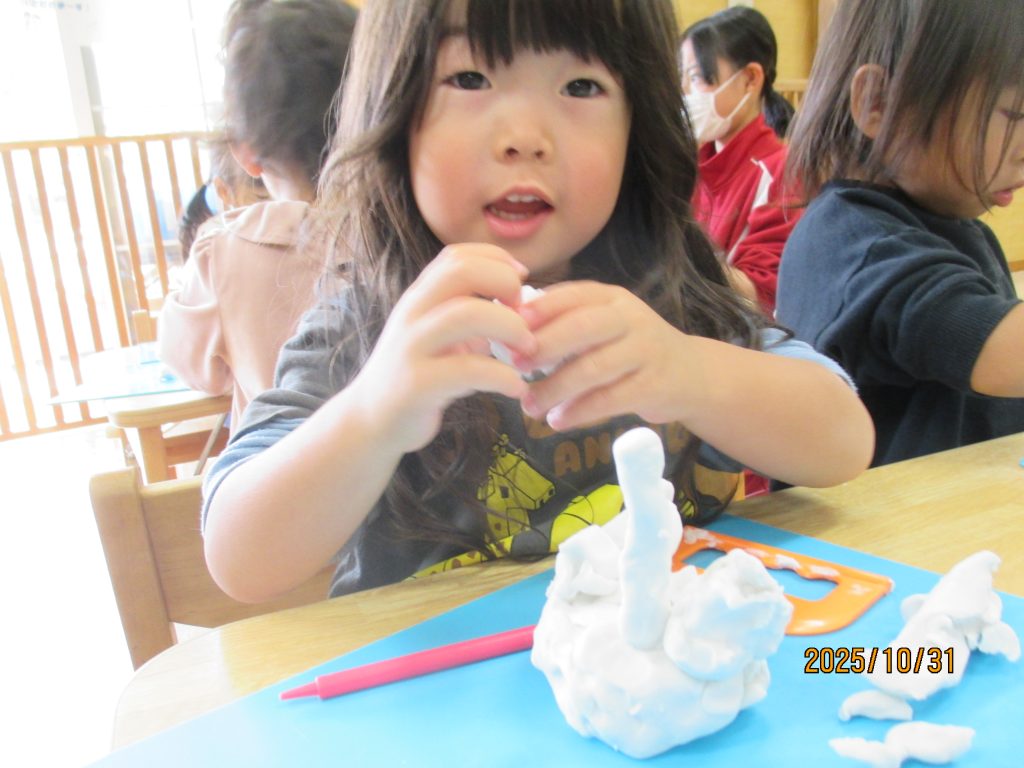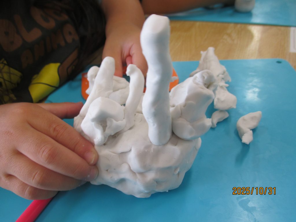 さくら組 粘土遊び投稿日: 更新日:2025年11月6日 投稿者: tetsunan 粘土遊びをしました。 今回は、粘土で使う道具を出し楽しみましたよ。 粘土を切ってみたよ。とっても真剣です。 粘土をこねて、研究中! ヘビをいっぱい作ったよ。 自分で丸めてみたよ。 ケーキを作り! 完成したよ!! 棒にクルクル巻いて遊んでみた!! 自分たちで、動物や食べ物等、好きな物を作れるようになってきました。 「○○なんだよ~」とイメージした物を作って、お友達と共有しながら楽しんでいましたよ。
