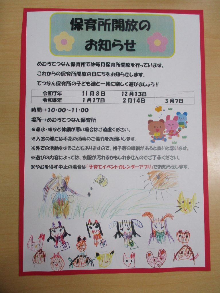 今年度後半の保育所開放のお知らせです。11月8日(土)てつなん保育所の開放(10:00~11:00)を行います。入所前のお友だちと保護者の方、保育所の子ども達と一緒に遊びませんか?