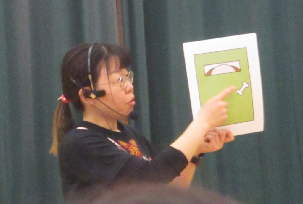 ドアの小さな窓から見える動物をすぐに言い当てる子ども達です。