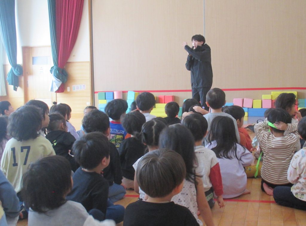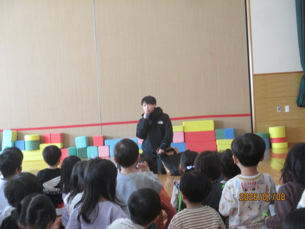 1月8日に防犯訓練がありました。警察署の方に協力していただき、不審者が侵入してきたと言う想定で行いました。不審者に気付いた保育者が対応し、その間に子どもたちは保育室内に避難し、戸が開かないようにしたり、目隠ししたりしました。子どもたちは保育者の話をよく聞いて、静かに避難できていました。