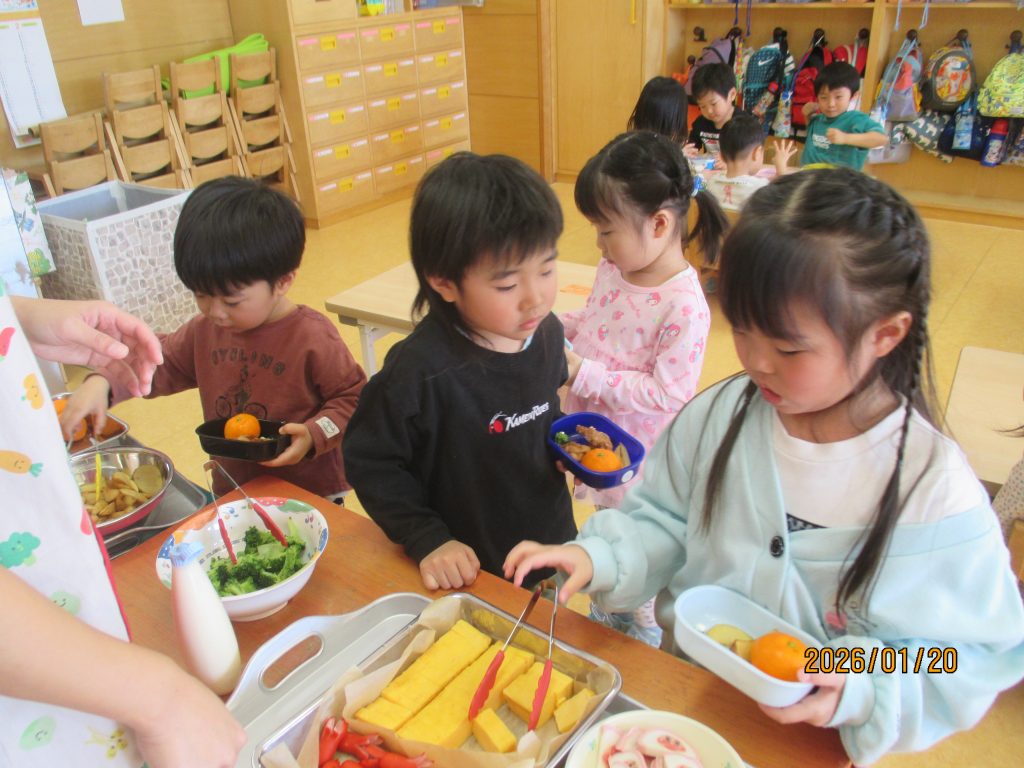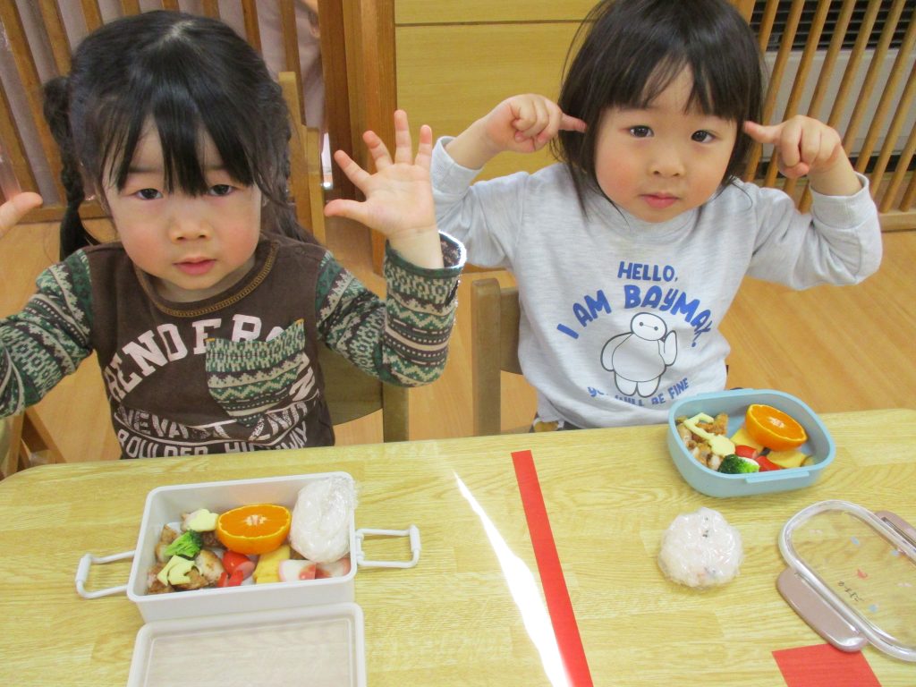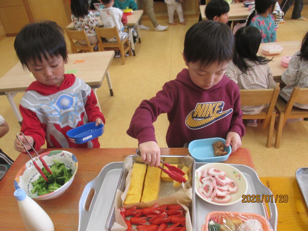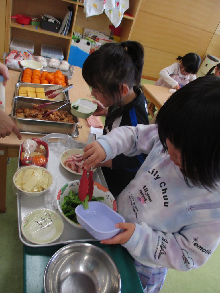 2歳児クラスは、お弁当箱におかずを詰めました。