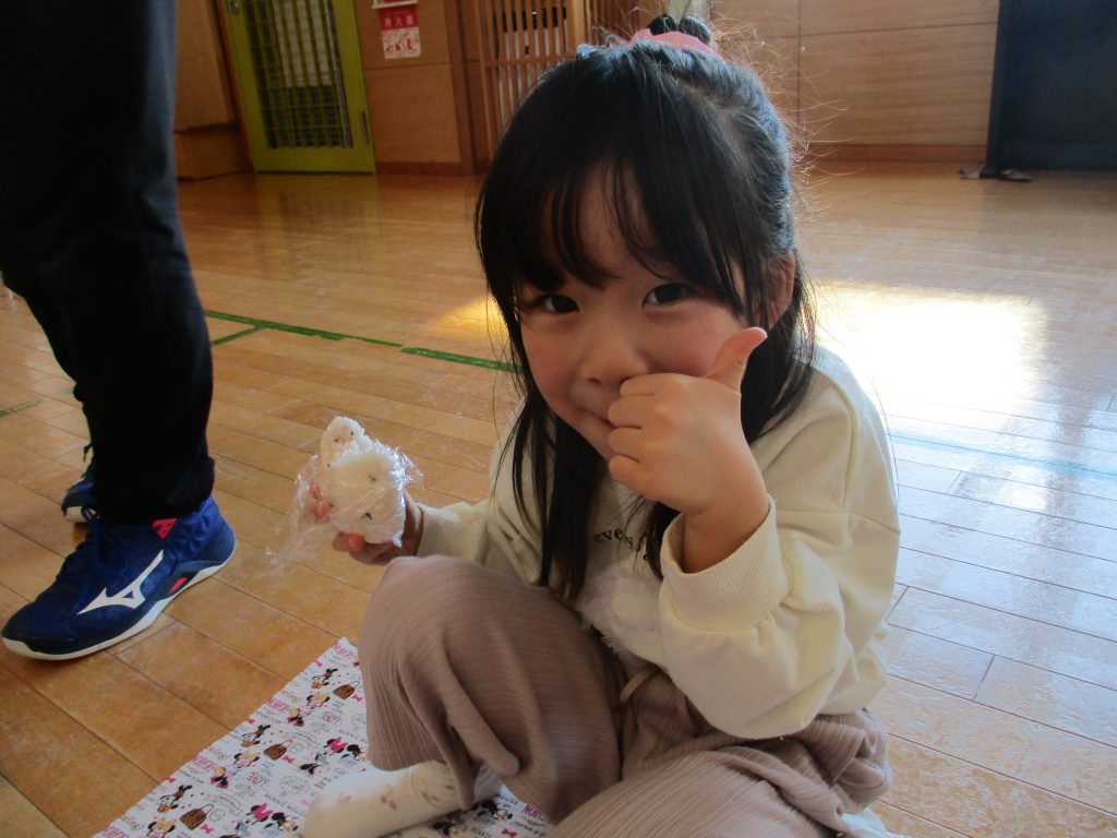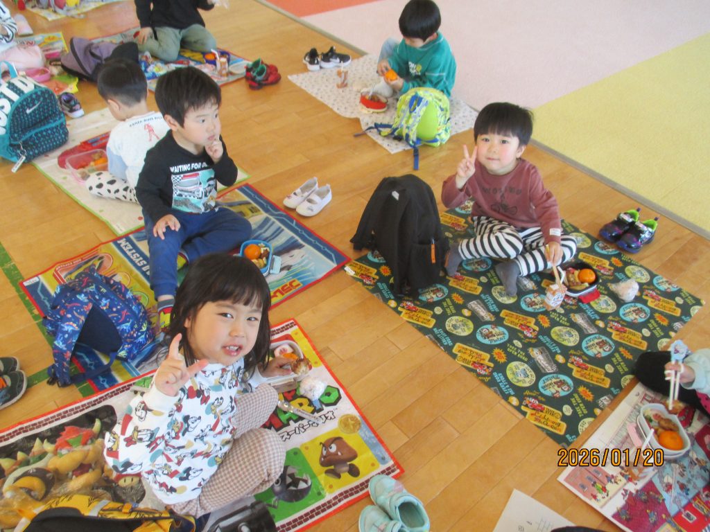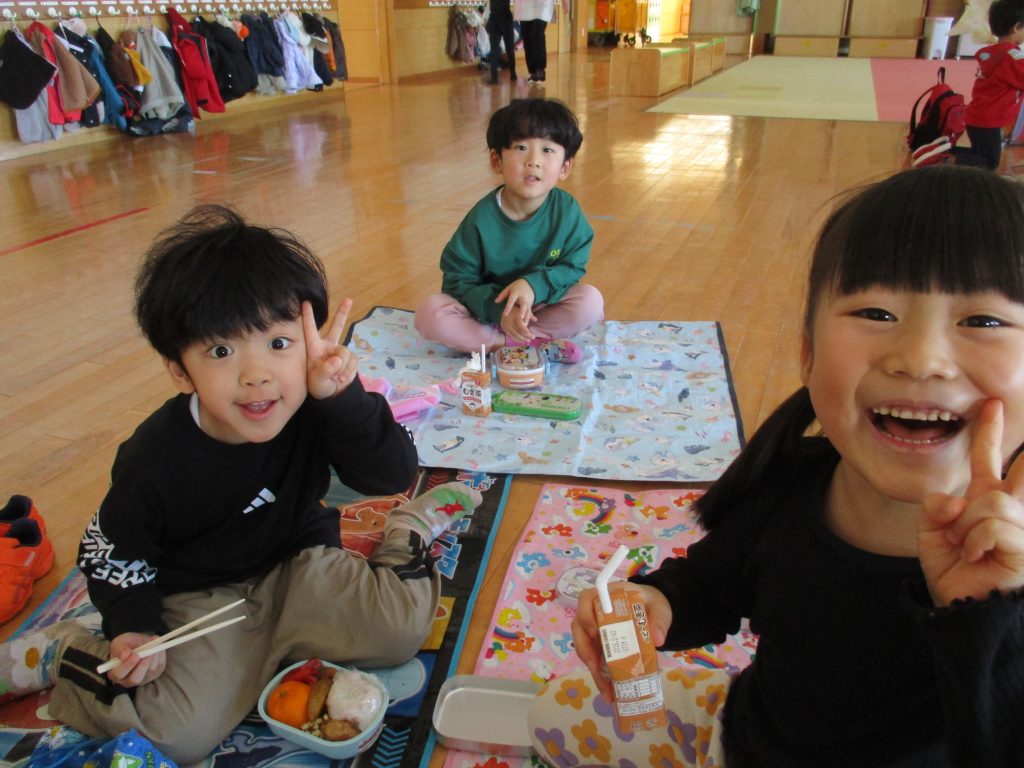 出来上がったお弁当を持って、遊戯室でシートを敷いて食べました。
