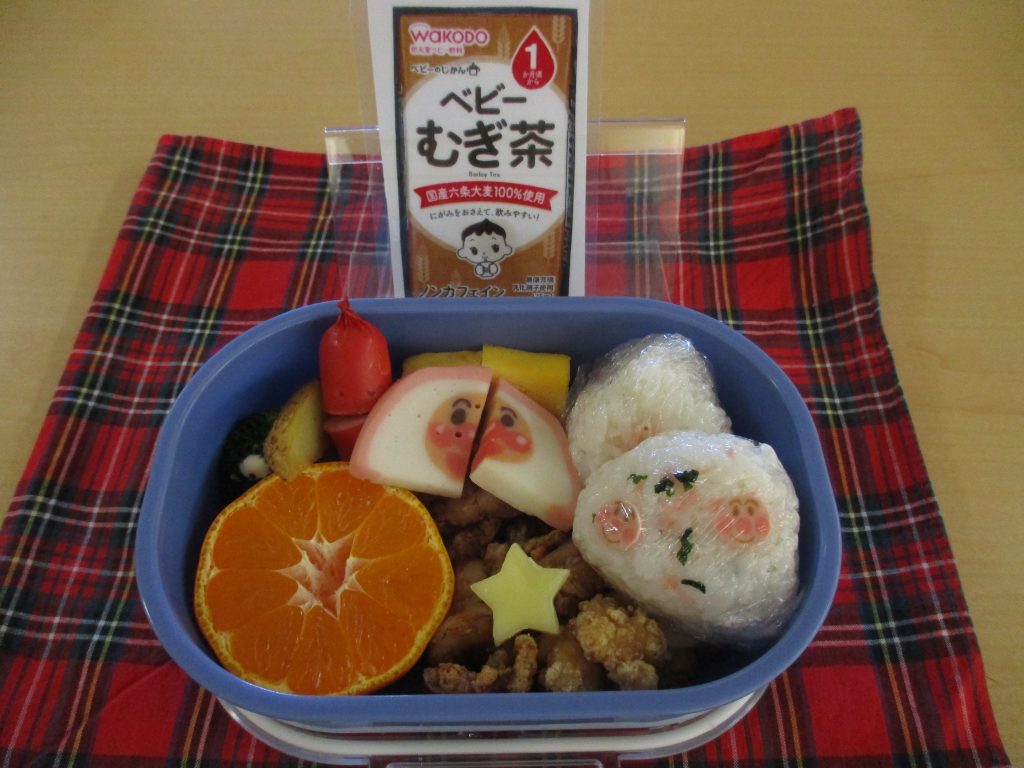 あんぱんまんおにぎりや型抜きチーズ、キャラクターかまぼこ、から揚げ、たこさんウインナー、厚焼き玉子焼き、ブロッコリー、みかんも入り、彩り豊かなお弁当の完成です。