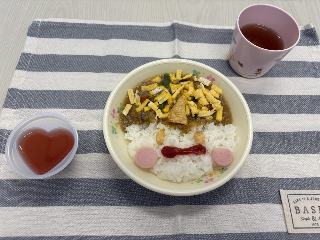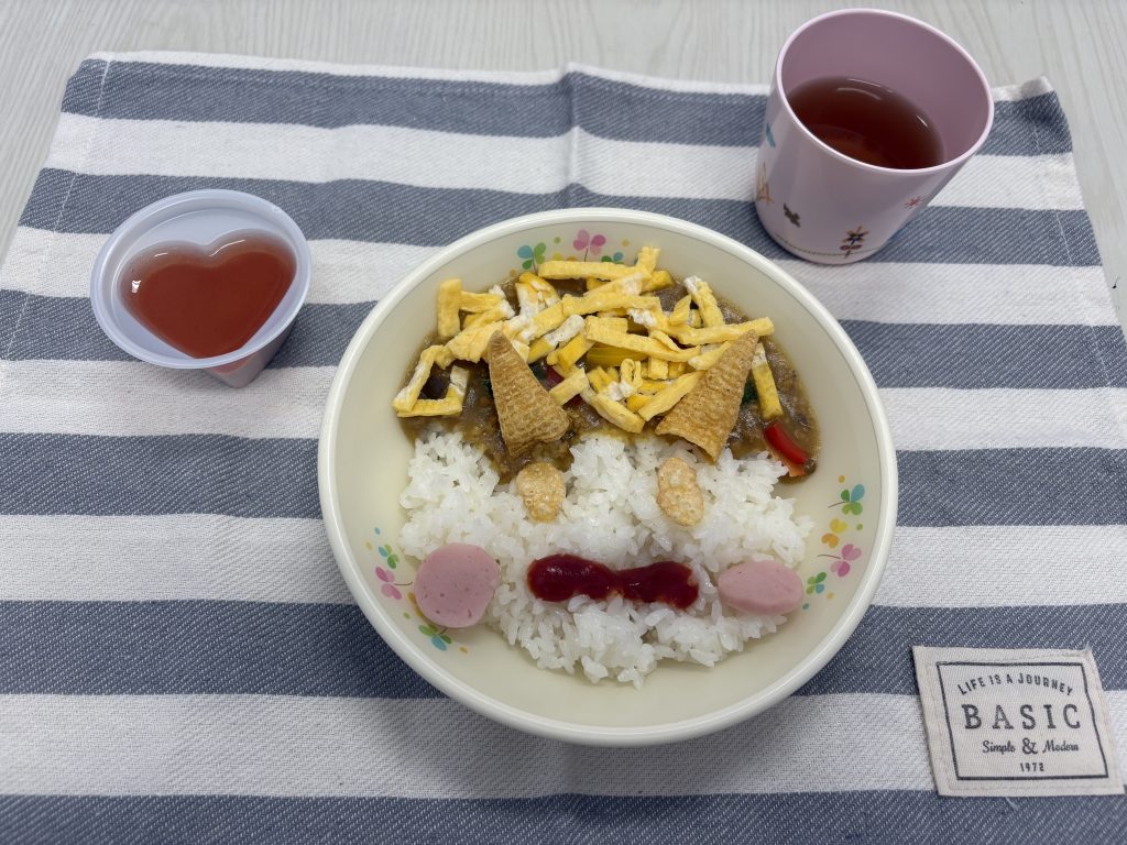 節分の行事食は、鬼の顔をイメージしたカレーライスに、ハートのゼリーを添えました。
